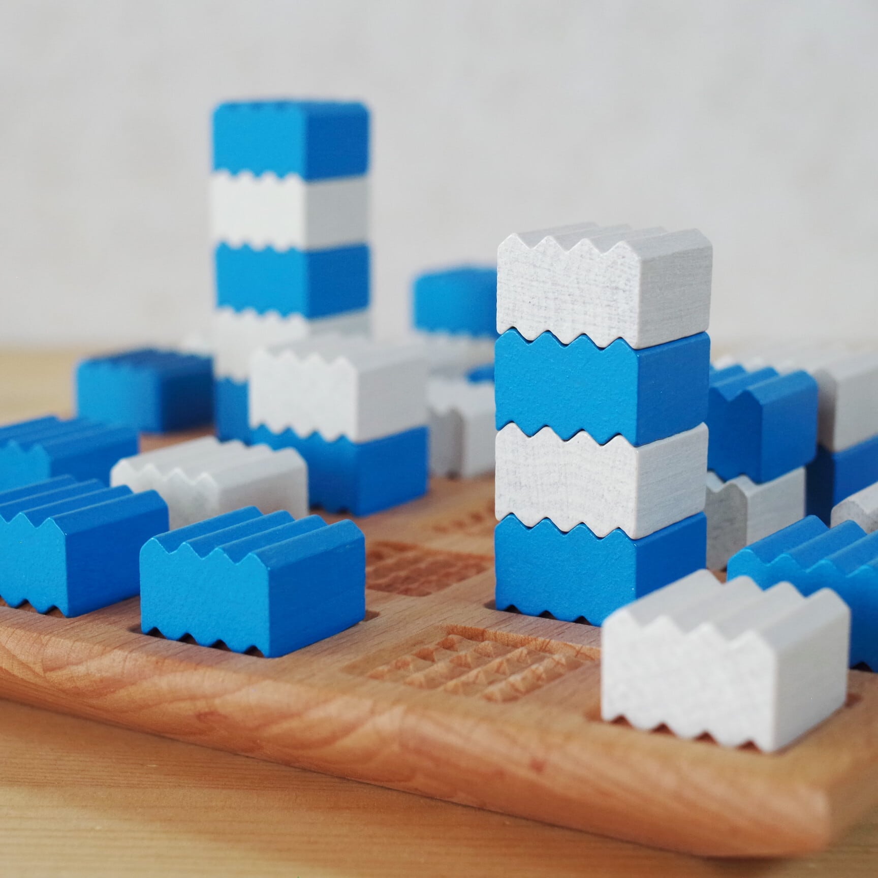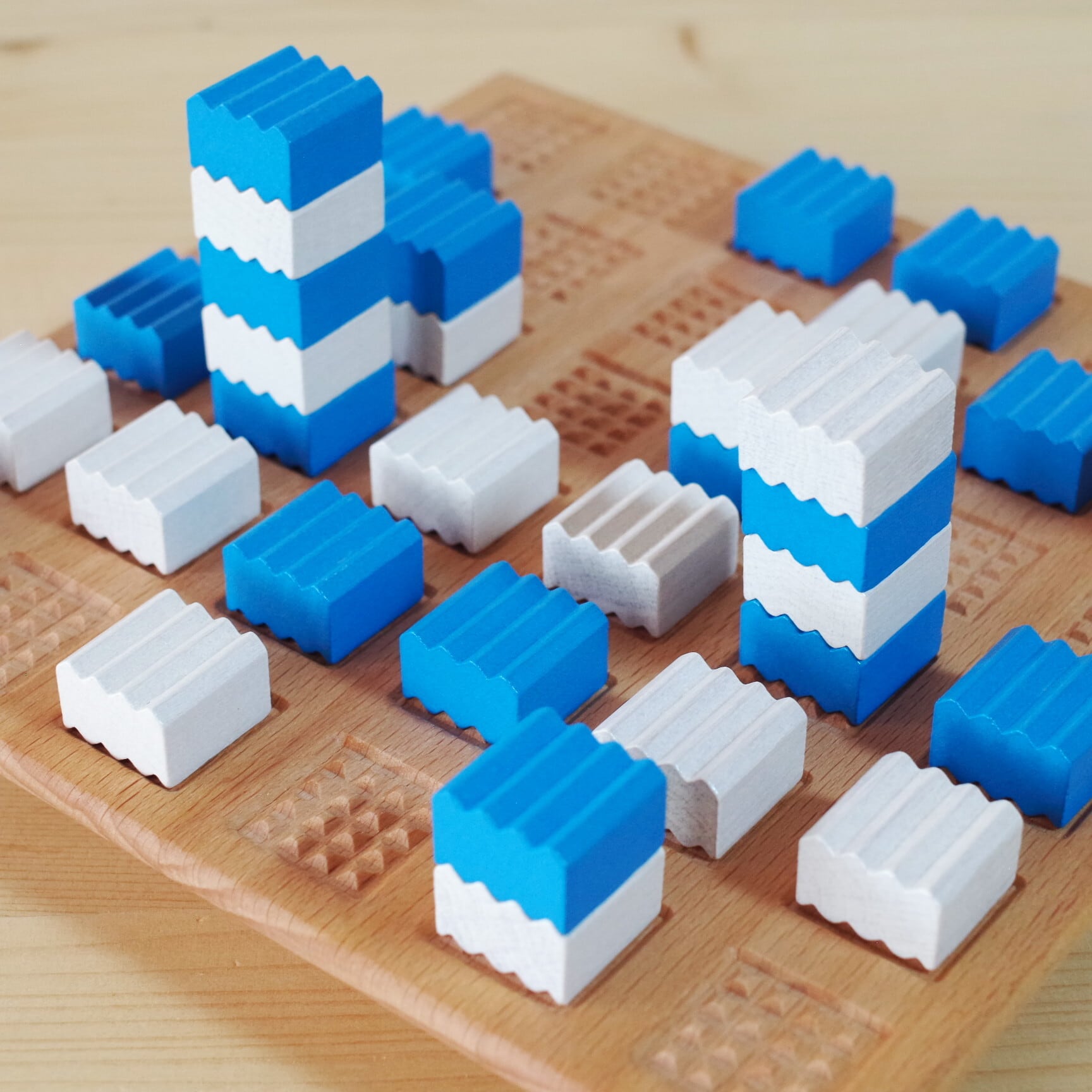 ボードに全ての駒を一段ずつ並べたところからスタートします。必ず2つの駒を飛び越えて駒を動かし、ゲームの終了時にそれぞれの塔の一番上にある色の駒のプレイヤーが勝利点を得られます。短いプレイ時間で何度もプレイしたくなるゲームです。