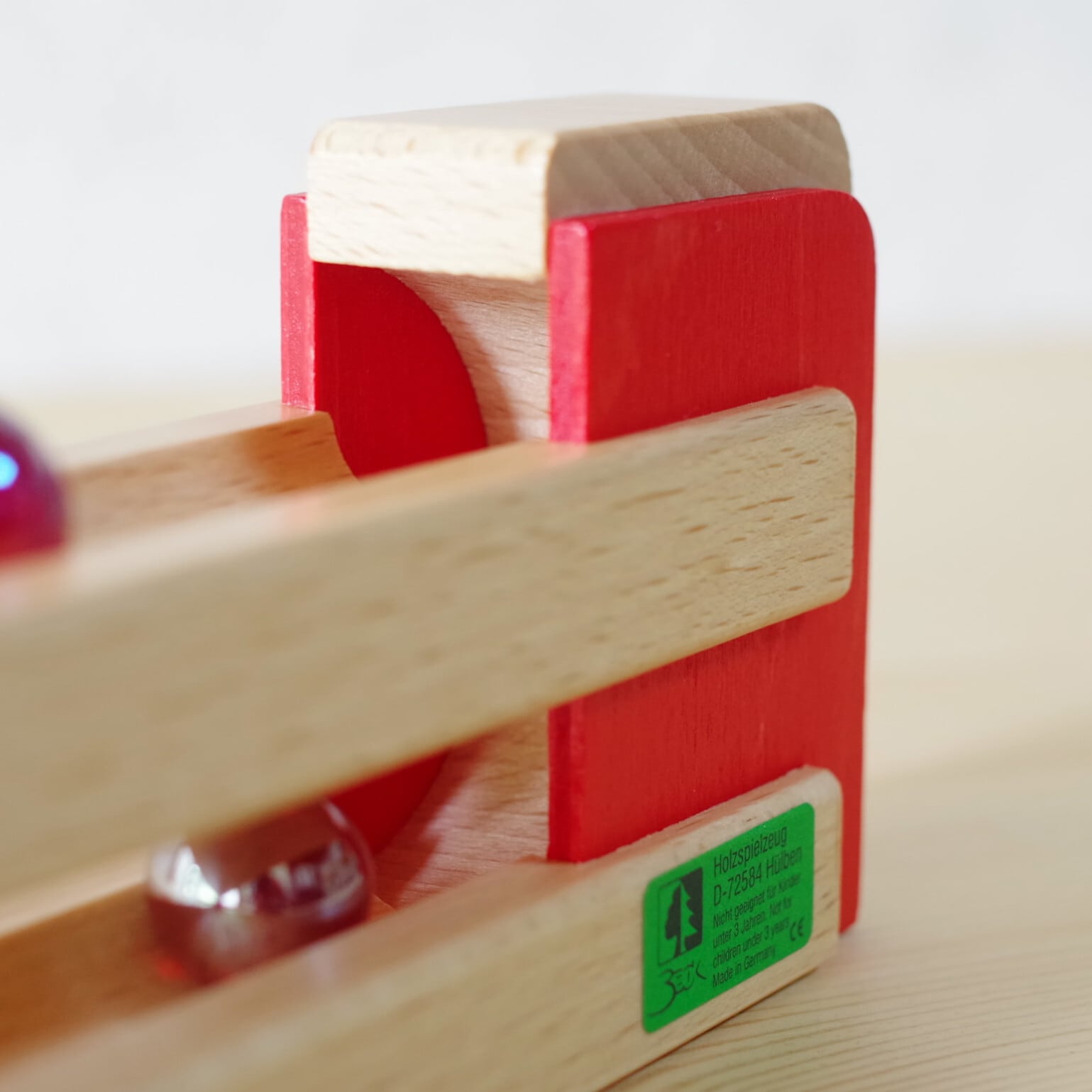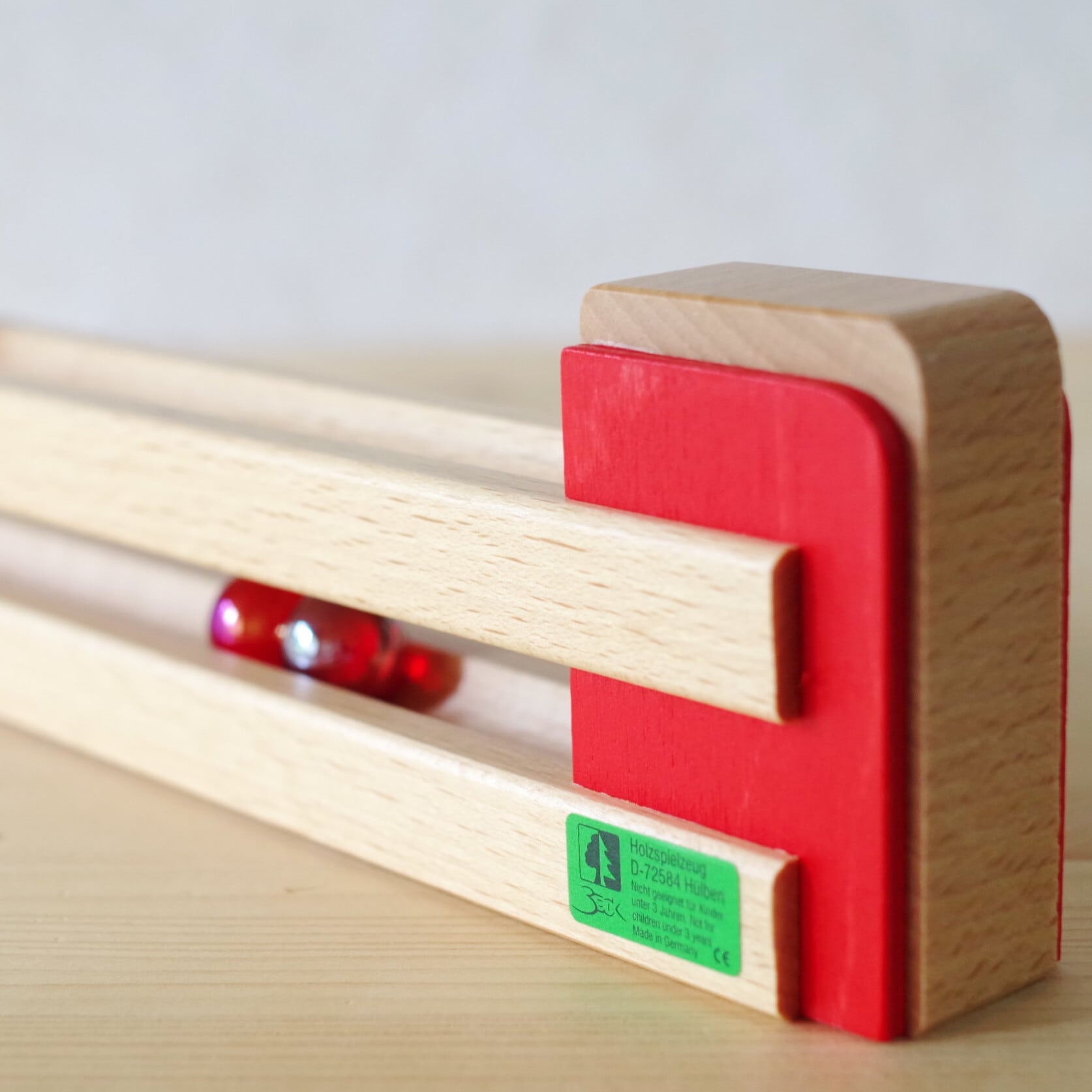達成感やまるで自分で玉を操縦しているような感覚、そして美しく流れるビー玉の一定のリズムに魅了された子どもたちは、何度もこの遊びを繰り返します。ビー玉と木のレールがぶつかるときに生まれる音も、心地よく感じられます。