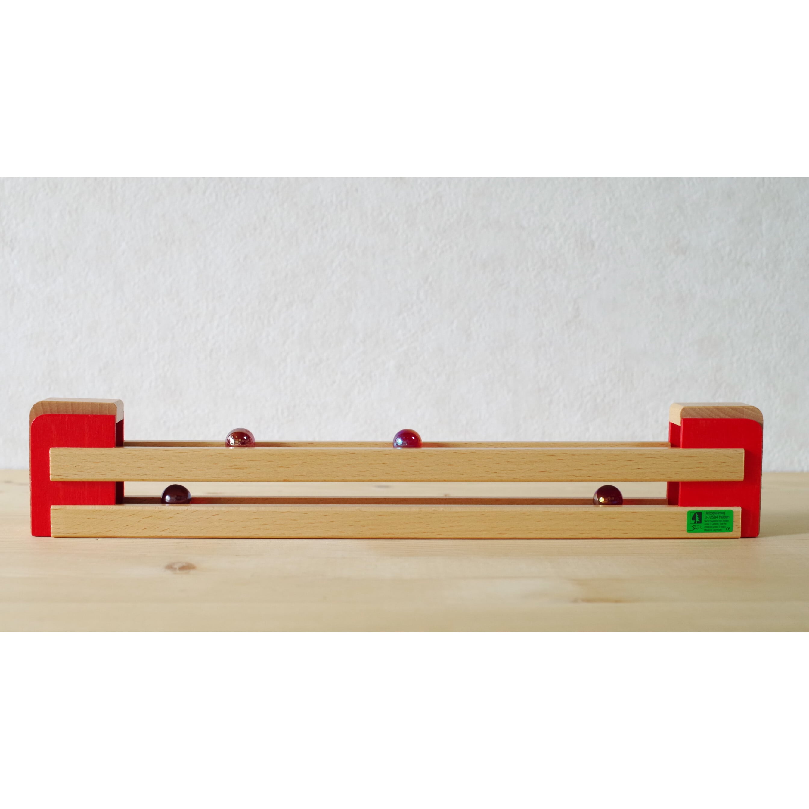 両手で赤い部分を持ち、レールをうまく動かして、ビー玉を上から下へ、または下から上へと走らせるバランス遊びです。