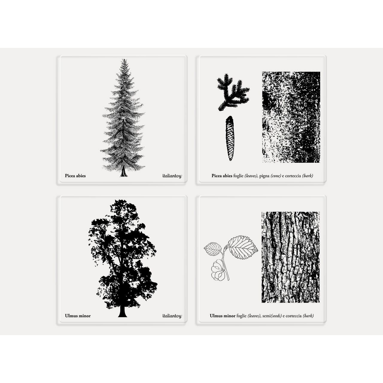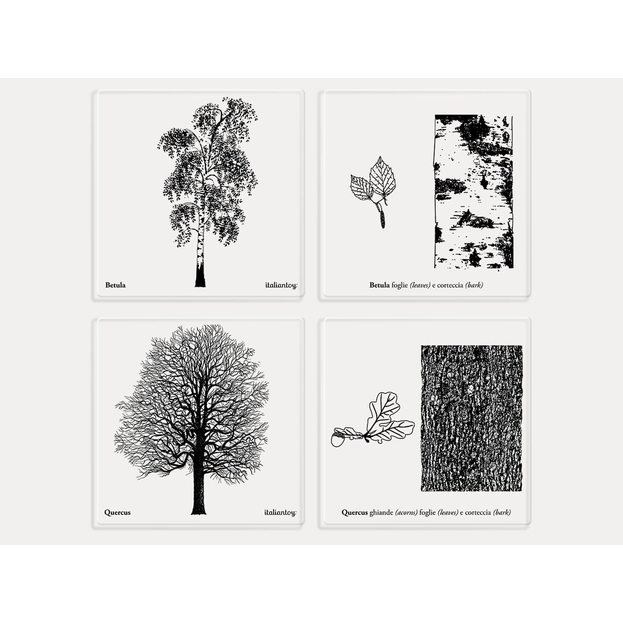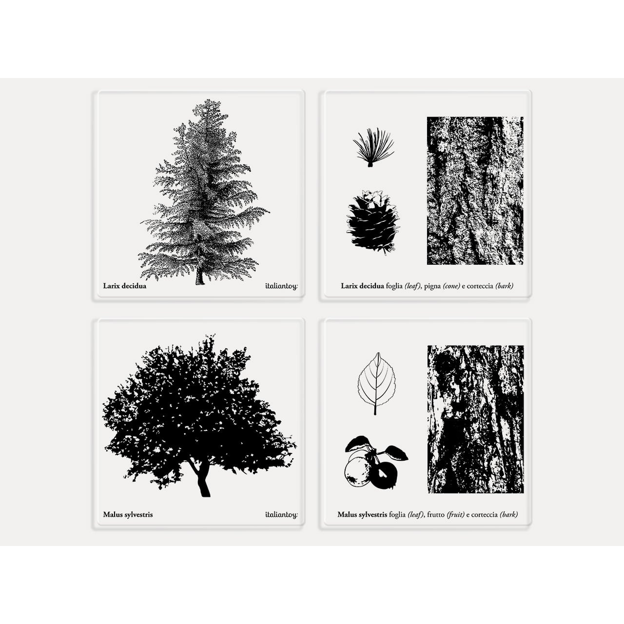 カバ・カラマツ・トウヒ・ナラ・ニレ・リンゴの6種の樹木のプラスチックカードが含まれており、それぞれ木の立ち姿・樹皮・果実が描かれています。