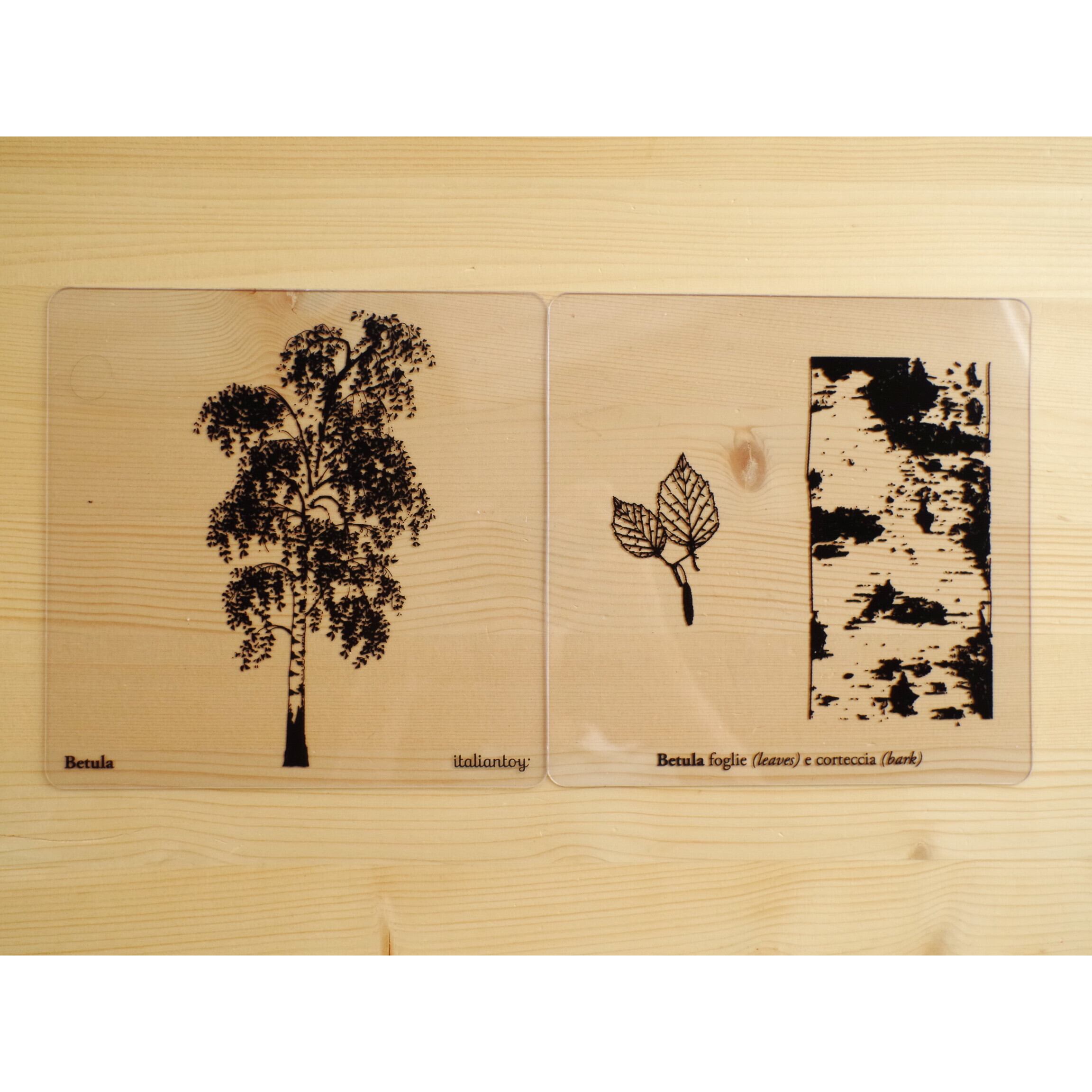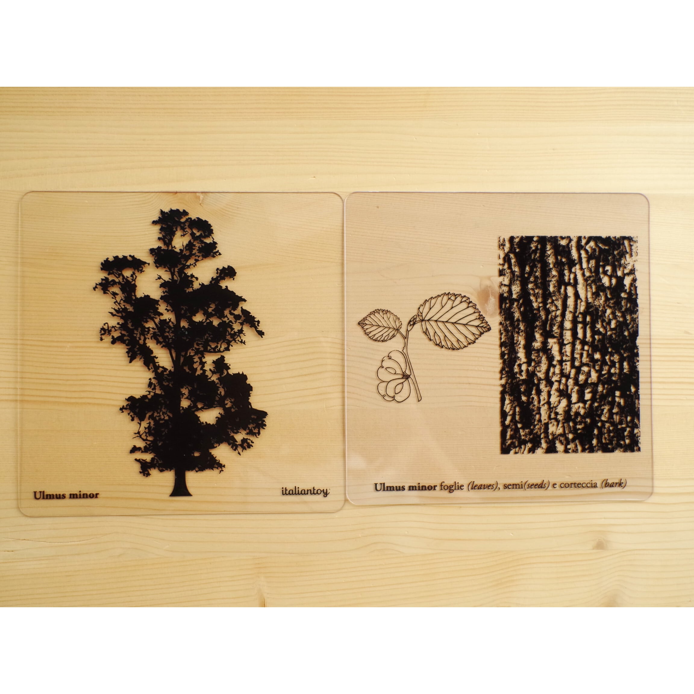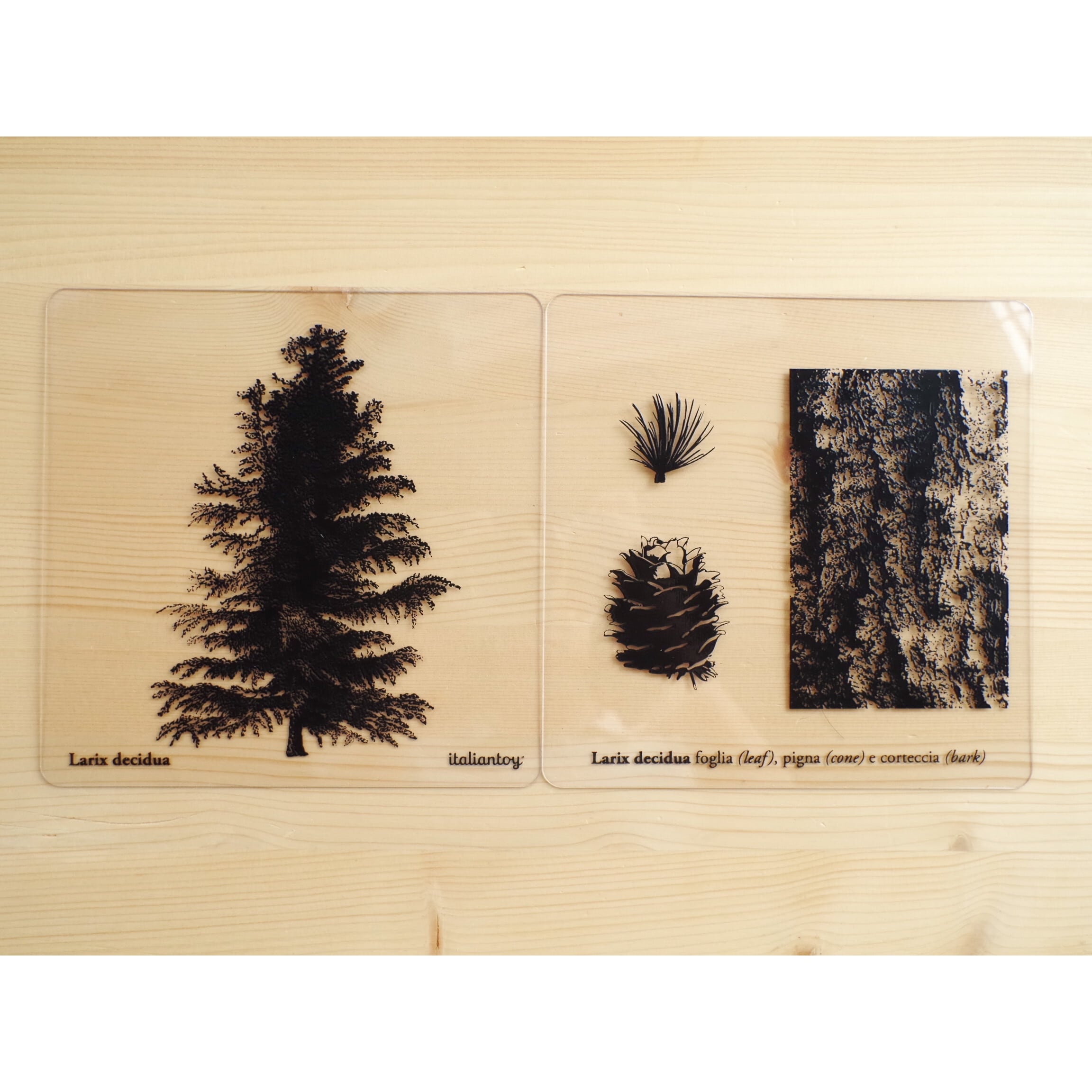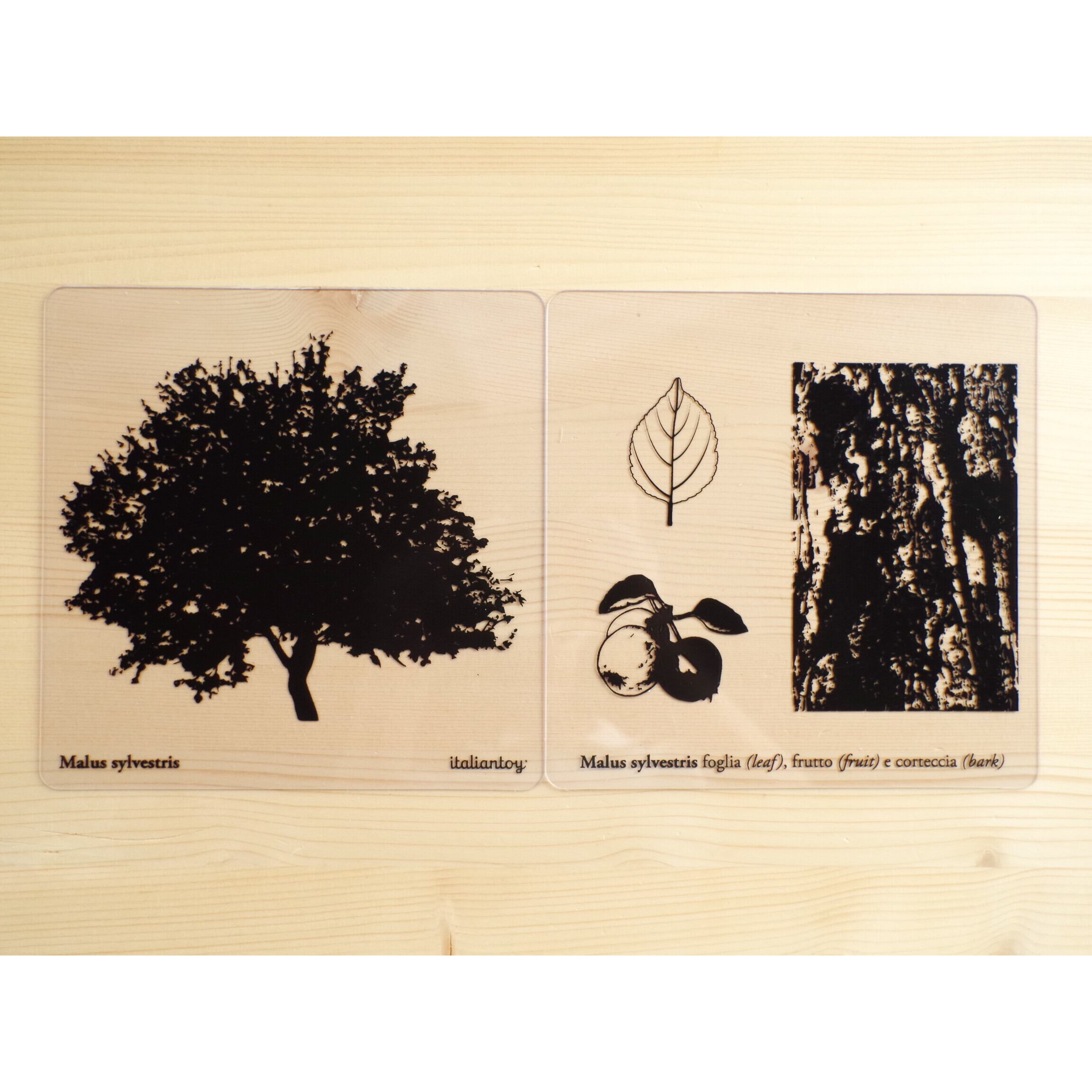 カバ・カラマツ・トウヒ・ナラ・ニレ・リンゴの6種の樹木のプラスチックカードが含まれており、それぞれ木の立ち姿・樹皮・果実が描かれています。