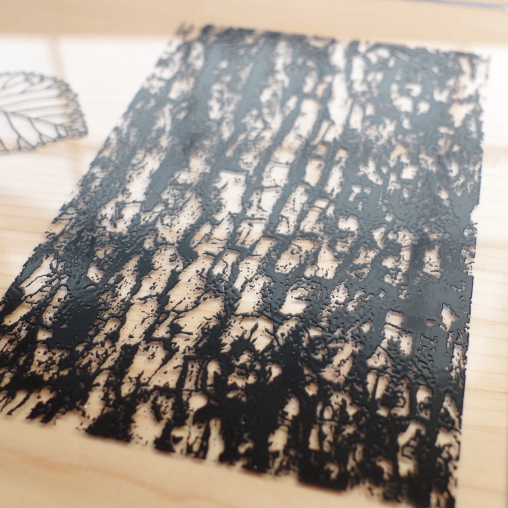 このプラスチックカードはエンボス加工(像や線を立体的に浮かび上がらせる加工)がされています。カードを紙の下に敷き、鉛筆やクレヨンなどでこする(あぶりだし・フロッタージュ)ことで、モチーフが浮かび上がってきます。