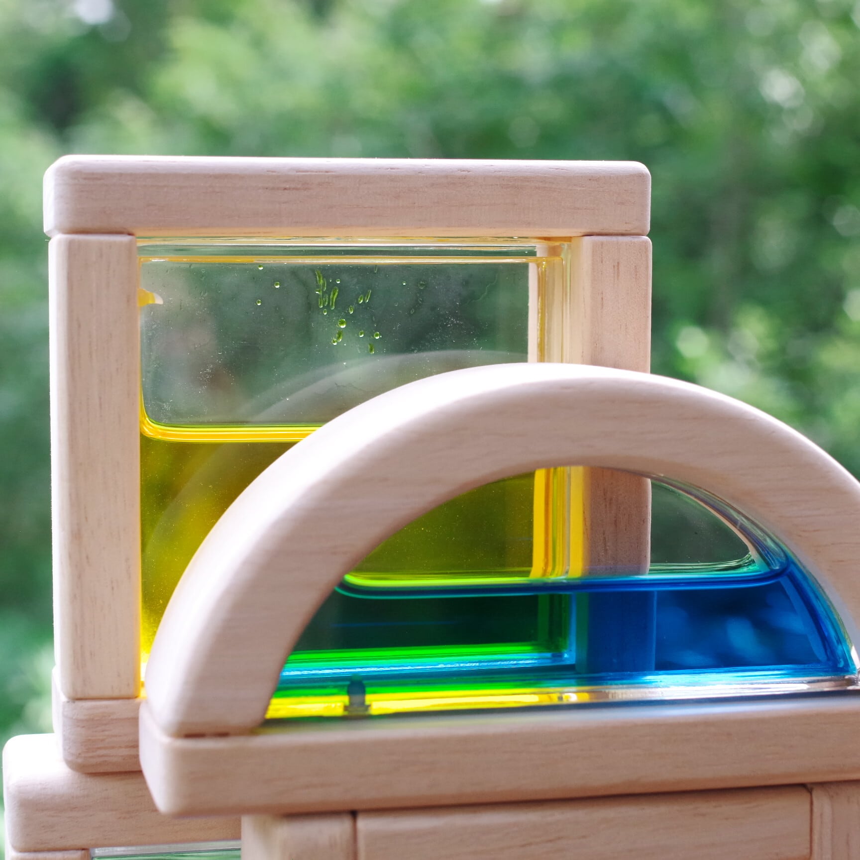 重ね合わせて光をかざすと、水の色が混ざり合って新しい色が生まれたり、ブロックの中でユラユラと波のように動く水の様子を眺めたり…水だからこそ楽しめる、特別な遊び方が広がります。