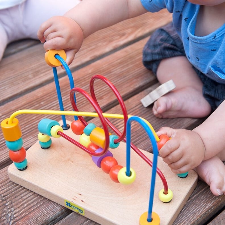 高強度のワイヤーを使用しており誤飲の心配がなく、0歳から安心して遊べます。指先の運動を促すだけでなく、色や形の認識、木玉が勢いよく滑り落ちる様子を楽しんだり…小さなお子さまが成長しても長く使える、飽きのこない玩具です。