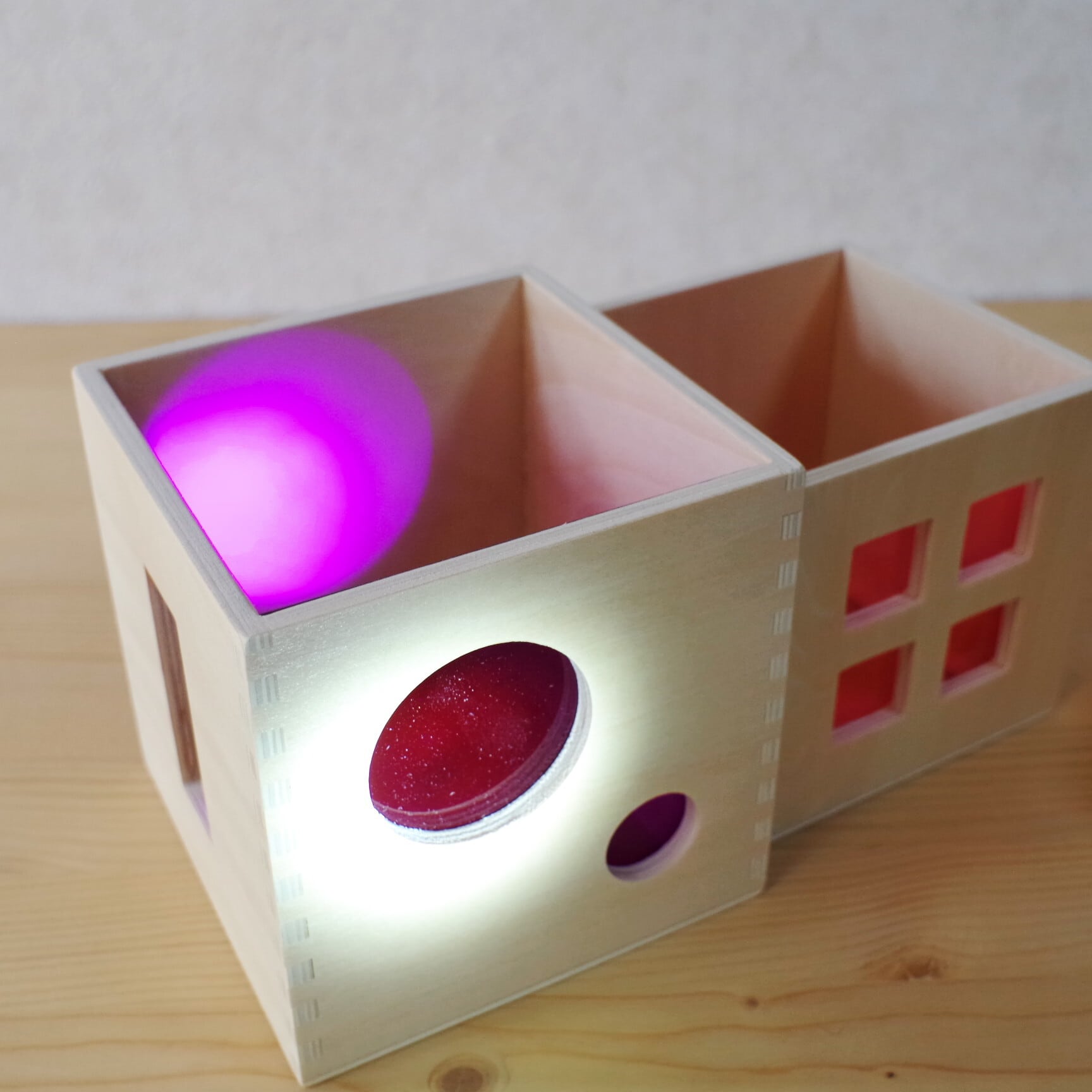 ・ ボックスを積み重ねた際、下の層にライトなどの光源を入れると、上部まで光が届く