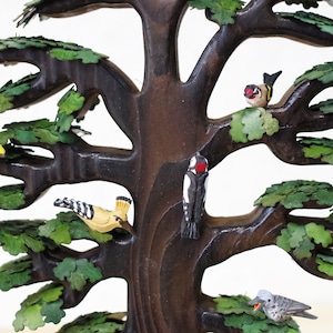 中でも特筆すべきは、葉の制作工程。平たい材を糸鋸で葉の形に切り出し、断面を丁寧に削ることで、繊細な葉を多数作り出します。それぞれの葉は、着色・乾燥・接着という気の遠くなるような工程を経て、一本の樫の木として完成します。年間の制作数はわずか15本ほどという希少な作品です。