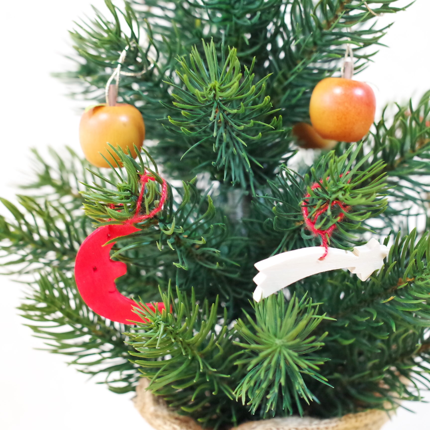 ダイニングテーブルにも置けるかわいい卓上ツリー。手ごろな価格でクリスマス気分を演出してくれます。ヴェルナー工房のリンゴのオーナメントとレロ社の小さなオーナメント9個セットです。