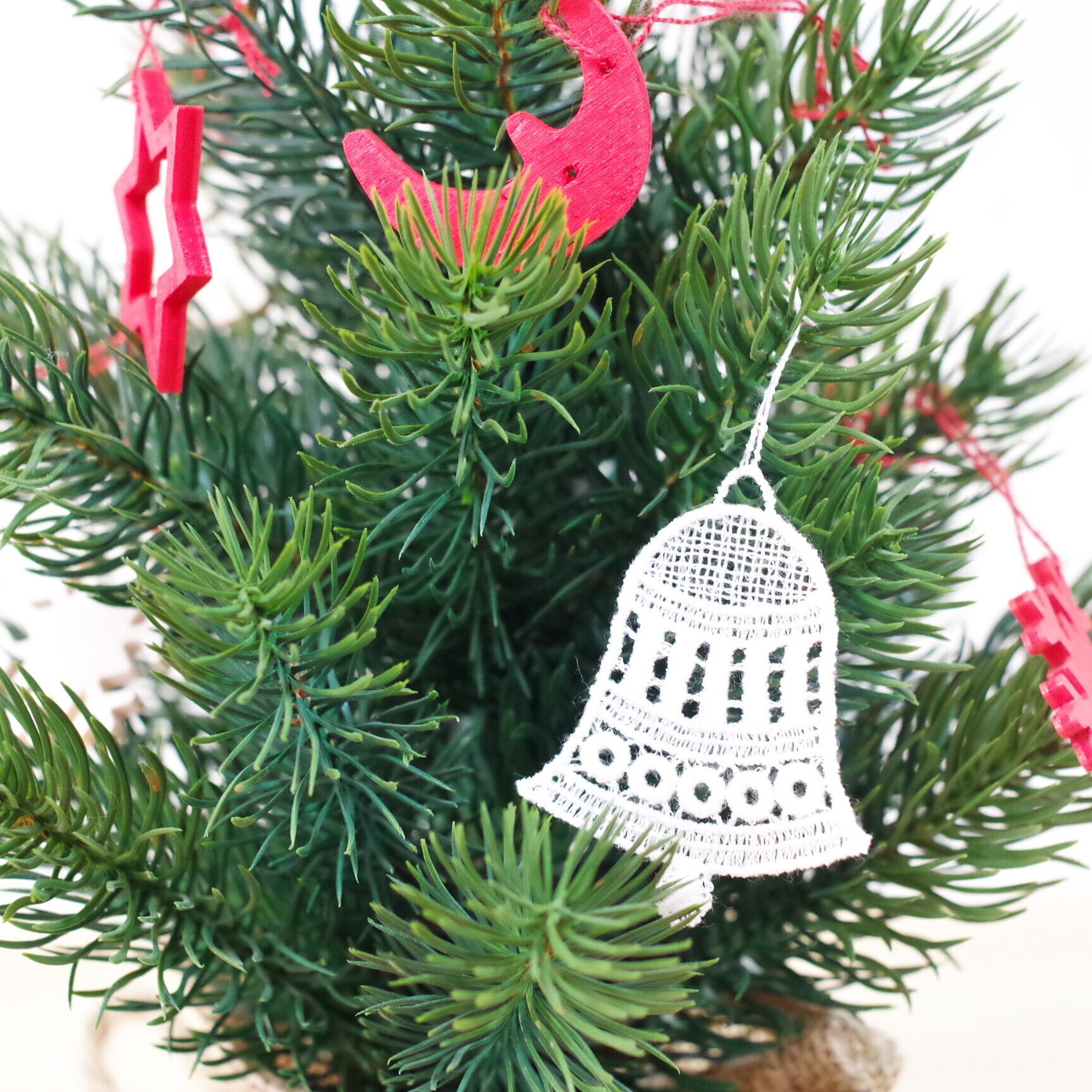ダイニングテーブルにも置けるかわいい卓上ツリー。手ごろな価格でクリスマス気分を演出してくれます。レロ社の小さなオーナメントとベルのレースのオーナメント10個セットです。