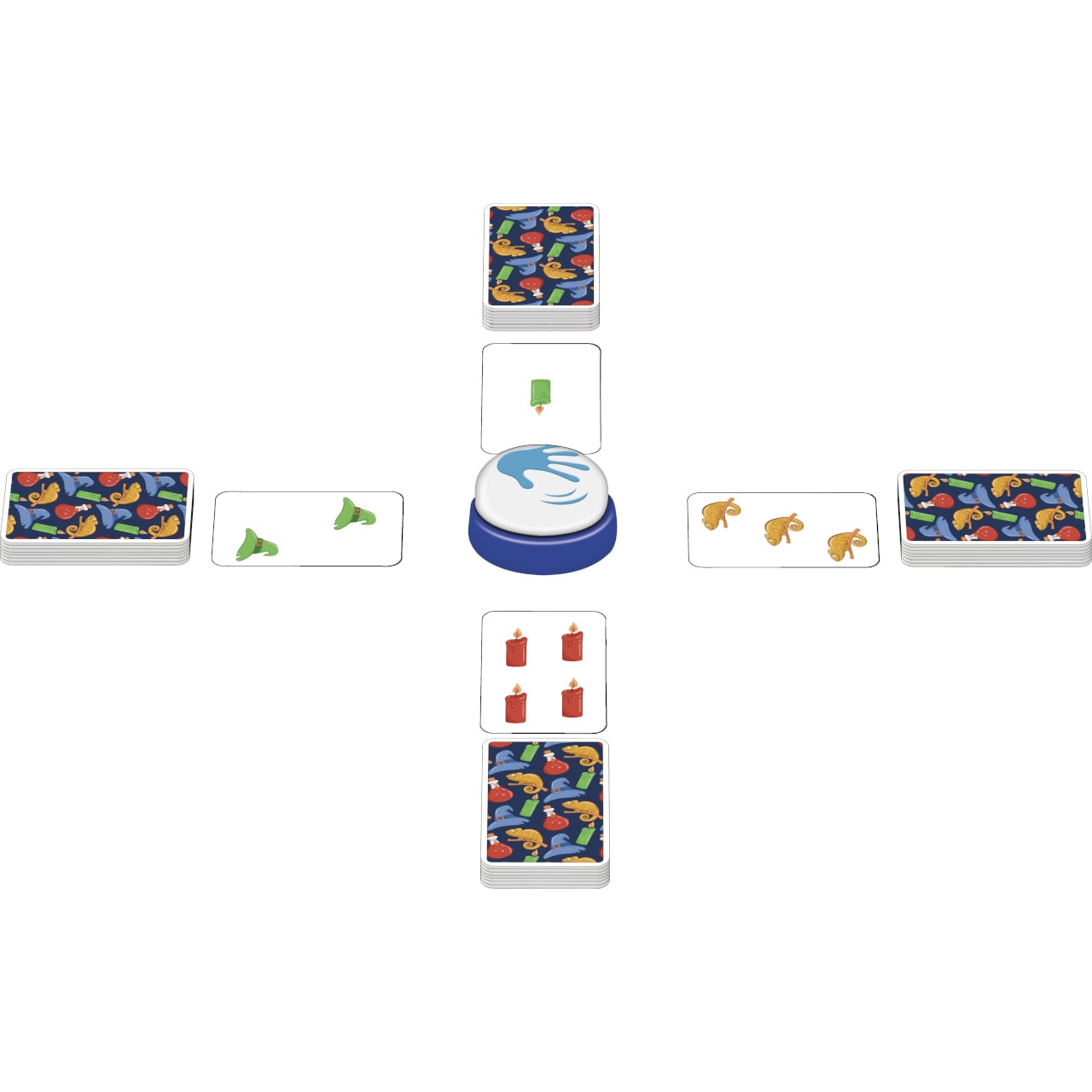 みんなでカードを均等に分けて、自分の前に裏向きの状態で山札にします。順番にカード一枚ずつめくっていき、同じシンボルか、色の数が5になったらすぐにベルを鳴らしにいきましょう!一番早くベルを鳴らせたプレイヤーが場に出ているカードを全てゲットします。
