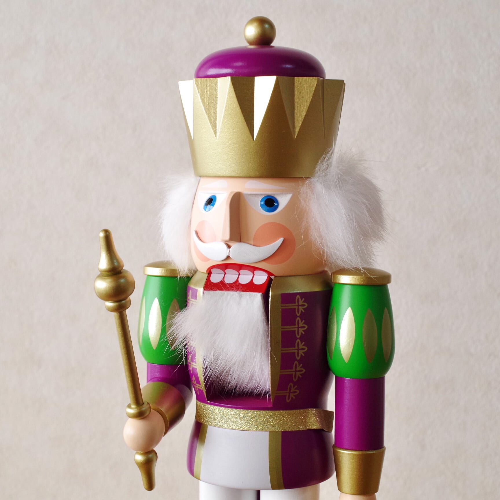 紫とグリーンというオシャレなカラーのくるみ割り人形。高さ40cmと存在感抜群!背中のレバーをあげると口が開き、下げると閉じます。