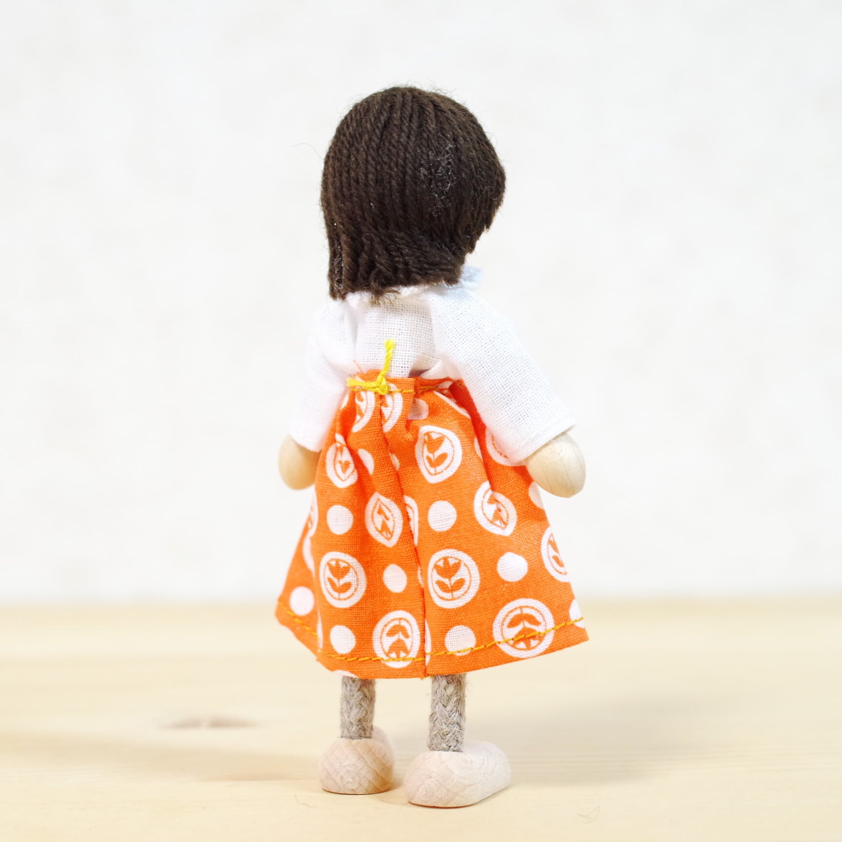 ドイツ・ヘアビック社のドールハウス遊びやごっこ遊びにピッタリな人形。その作りの丁寧さから作り手の愛情が伝わってきますね。手足に針金が入っているので、自由にポーズをとることができます。