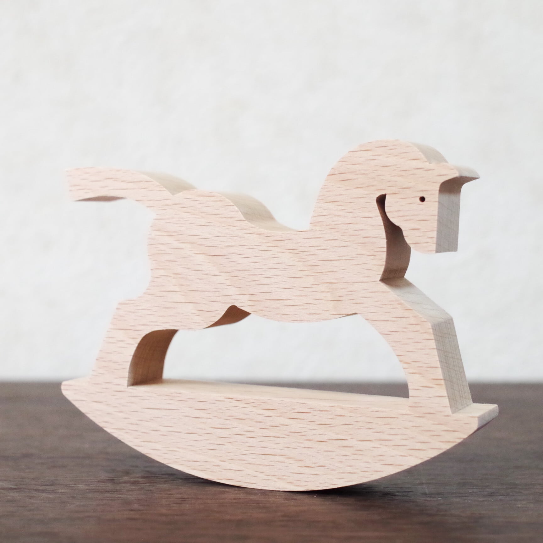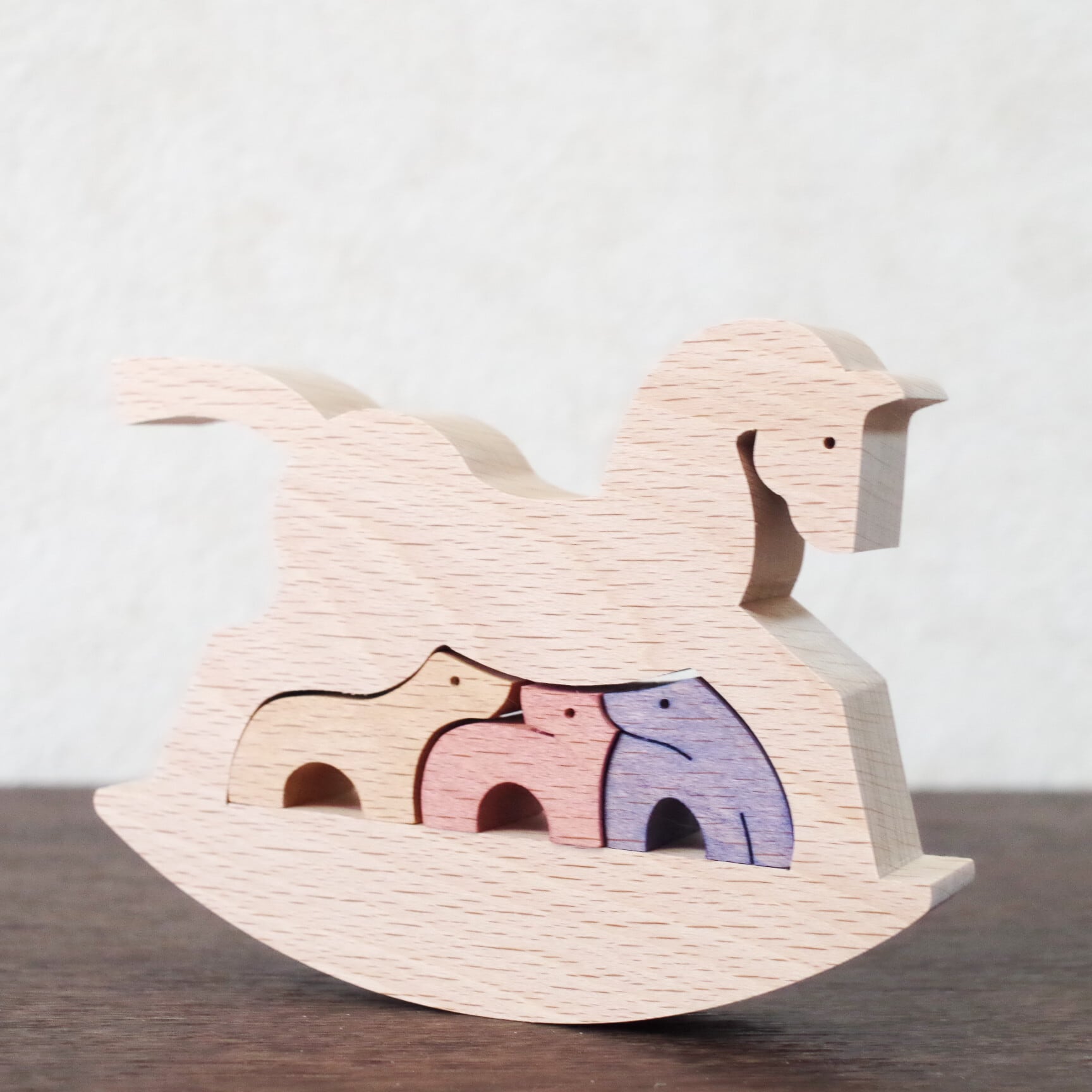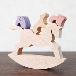 親ウマの足元に、3頭の仔馬がすっぽり収まる組み木。木馬のようにユラユラと動きを出したり、仔馬をいろんなレイアウトでディスプレイして楽しみましょう。
