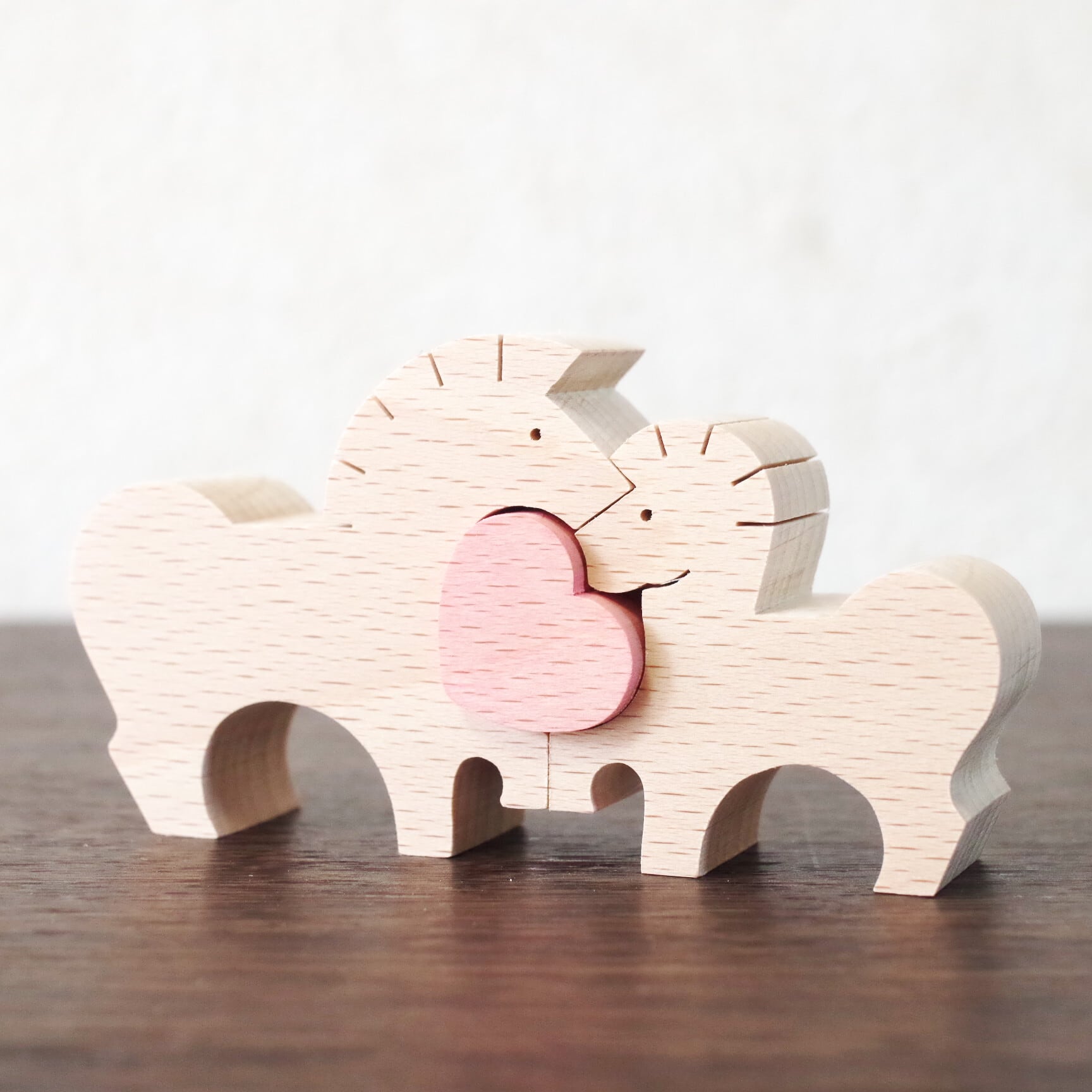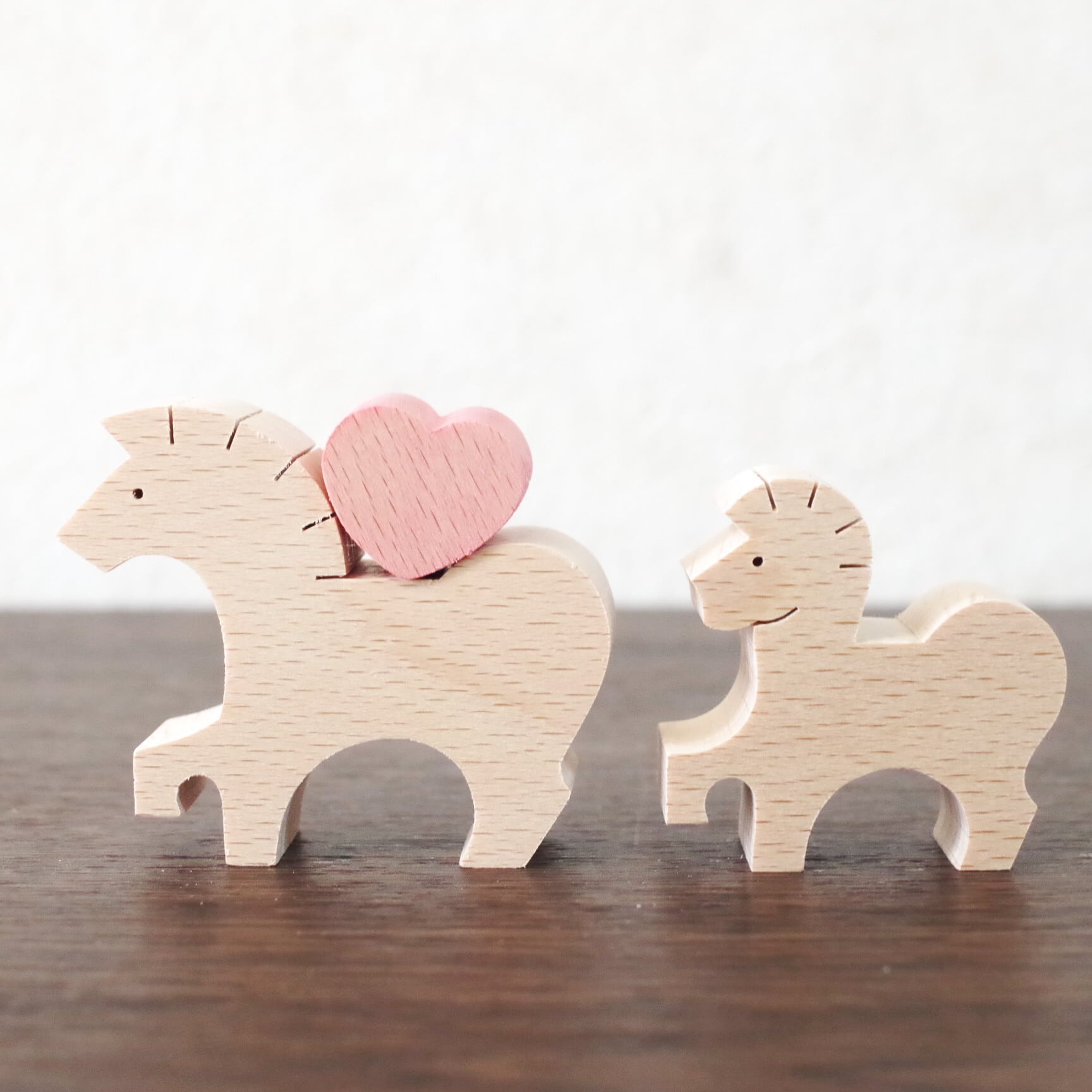 ウマのつがいにハートを合わせた、愛らしい組み木です。