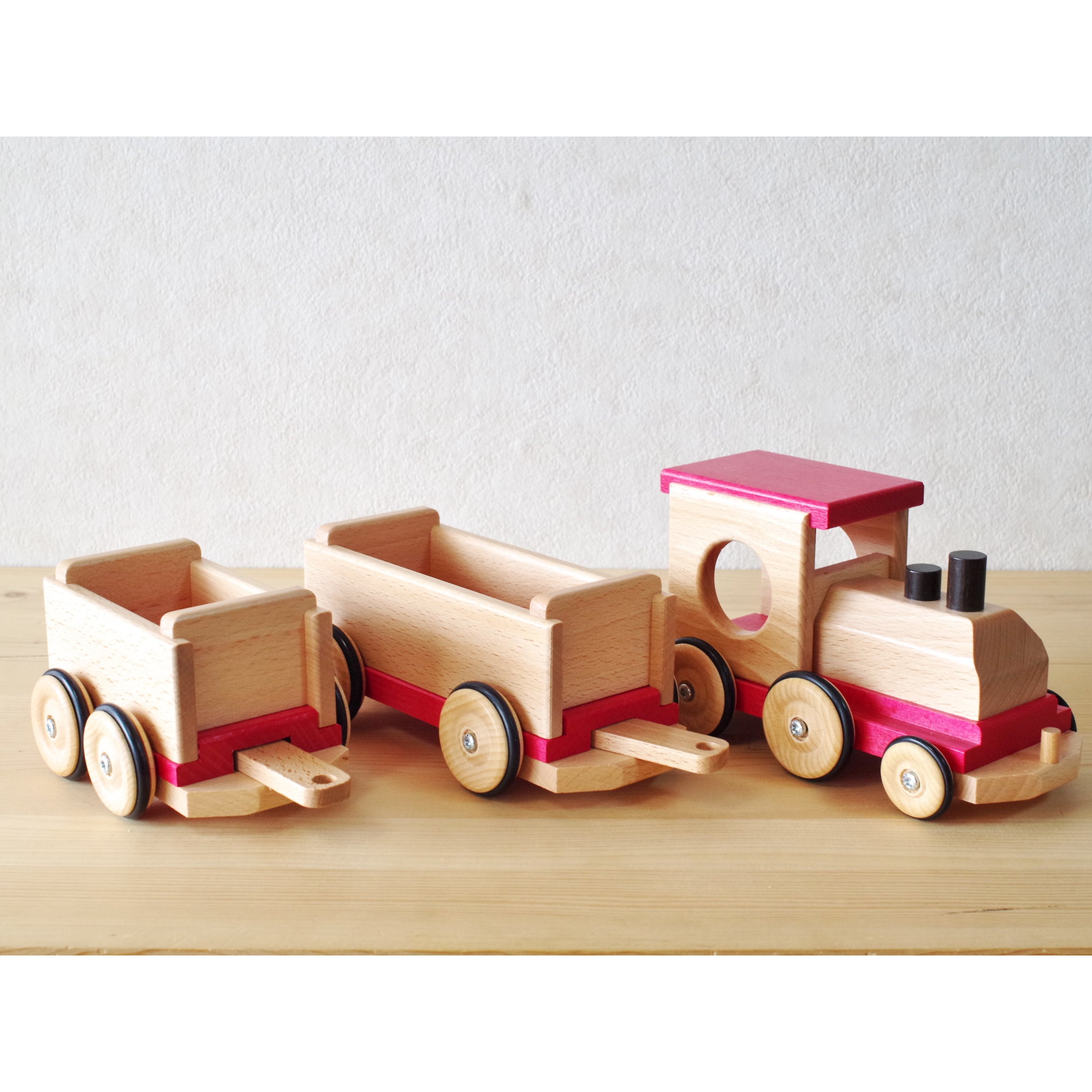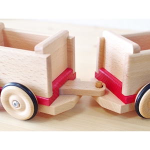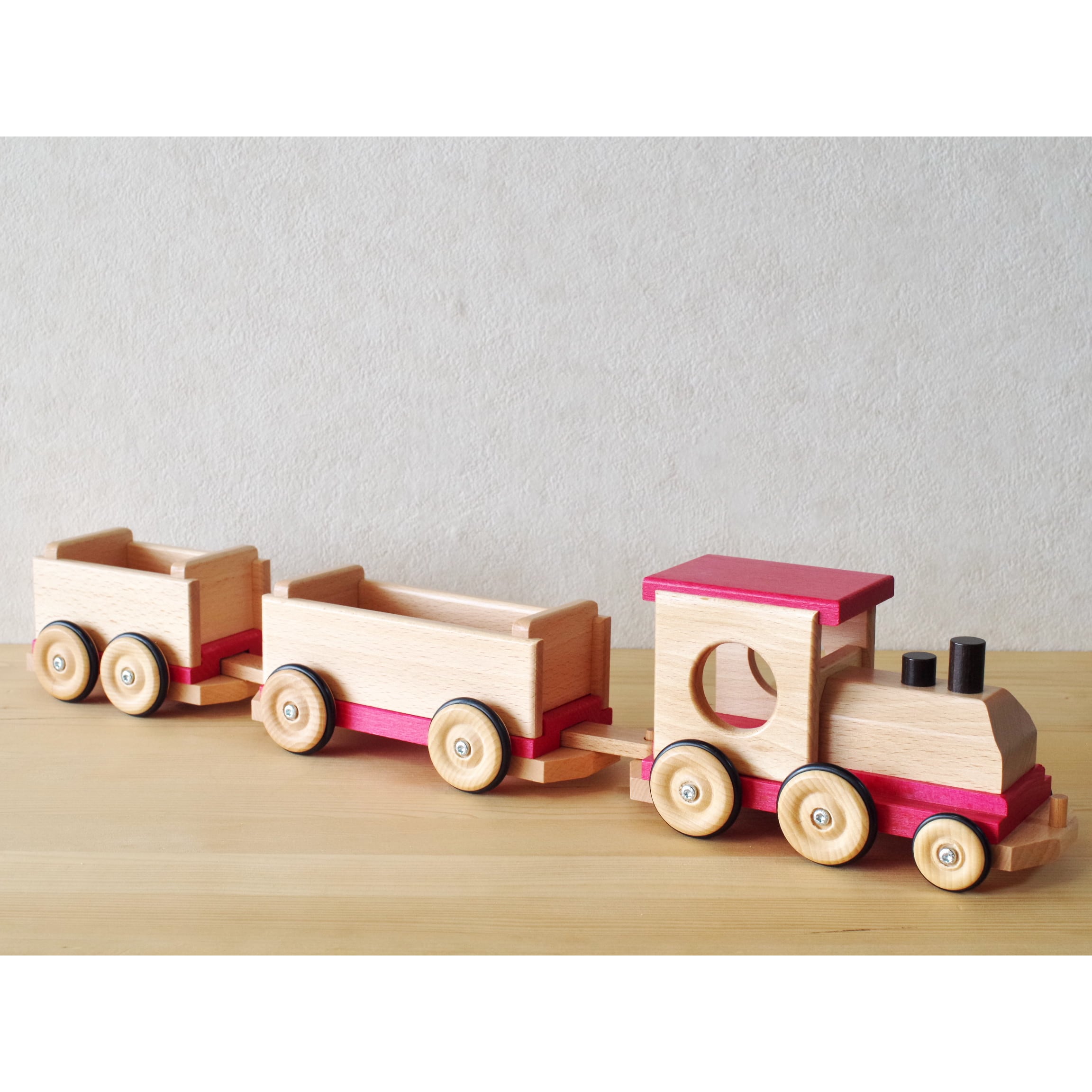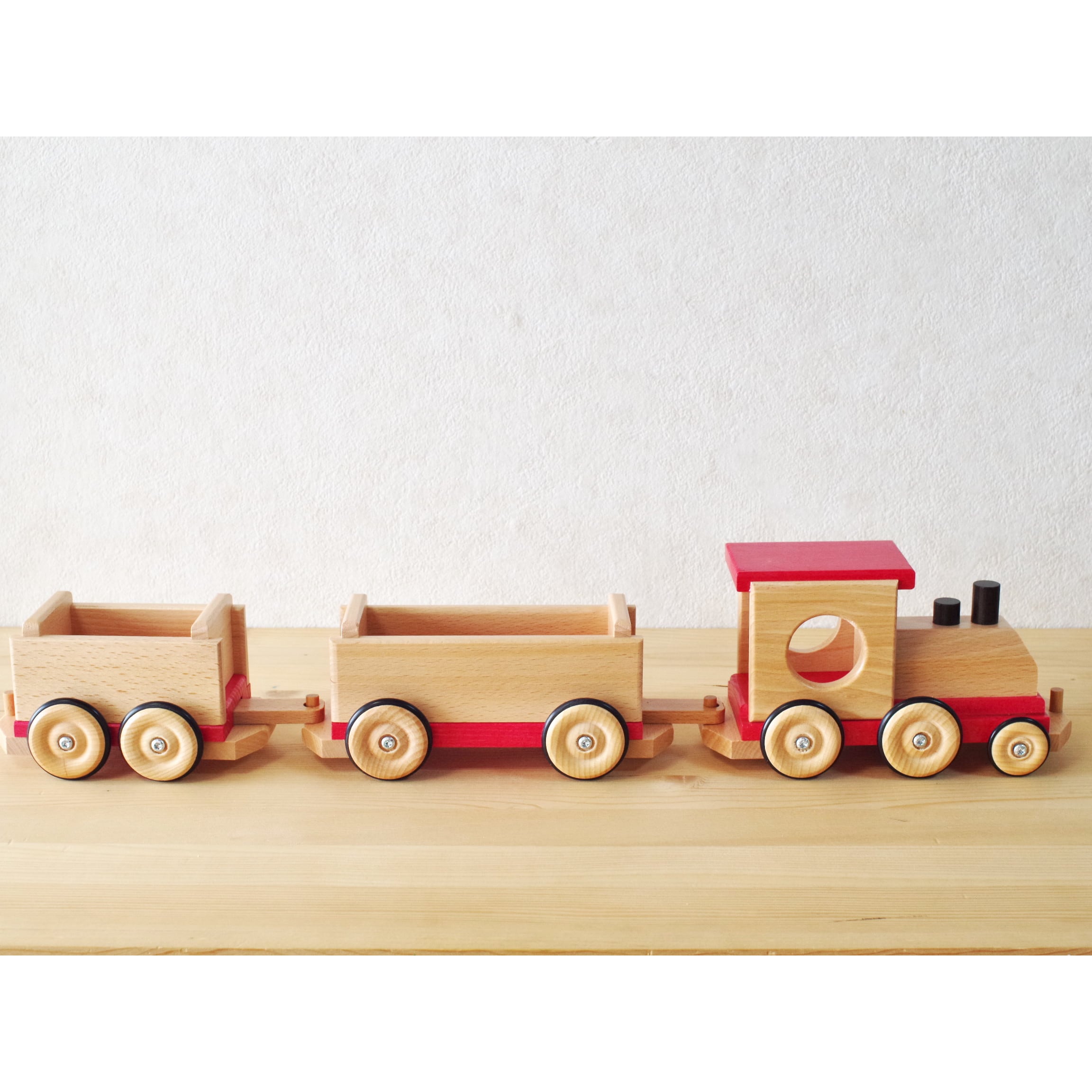 3両つなげると全長56cmと、大ぶりで丈夫な機関車です。荷台や先頭車両の乗り口も大きく、たくさんの荷物や人を乗せることができます。前の車両の突起に穴を引っ掛けることで簡単に連結ができます。