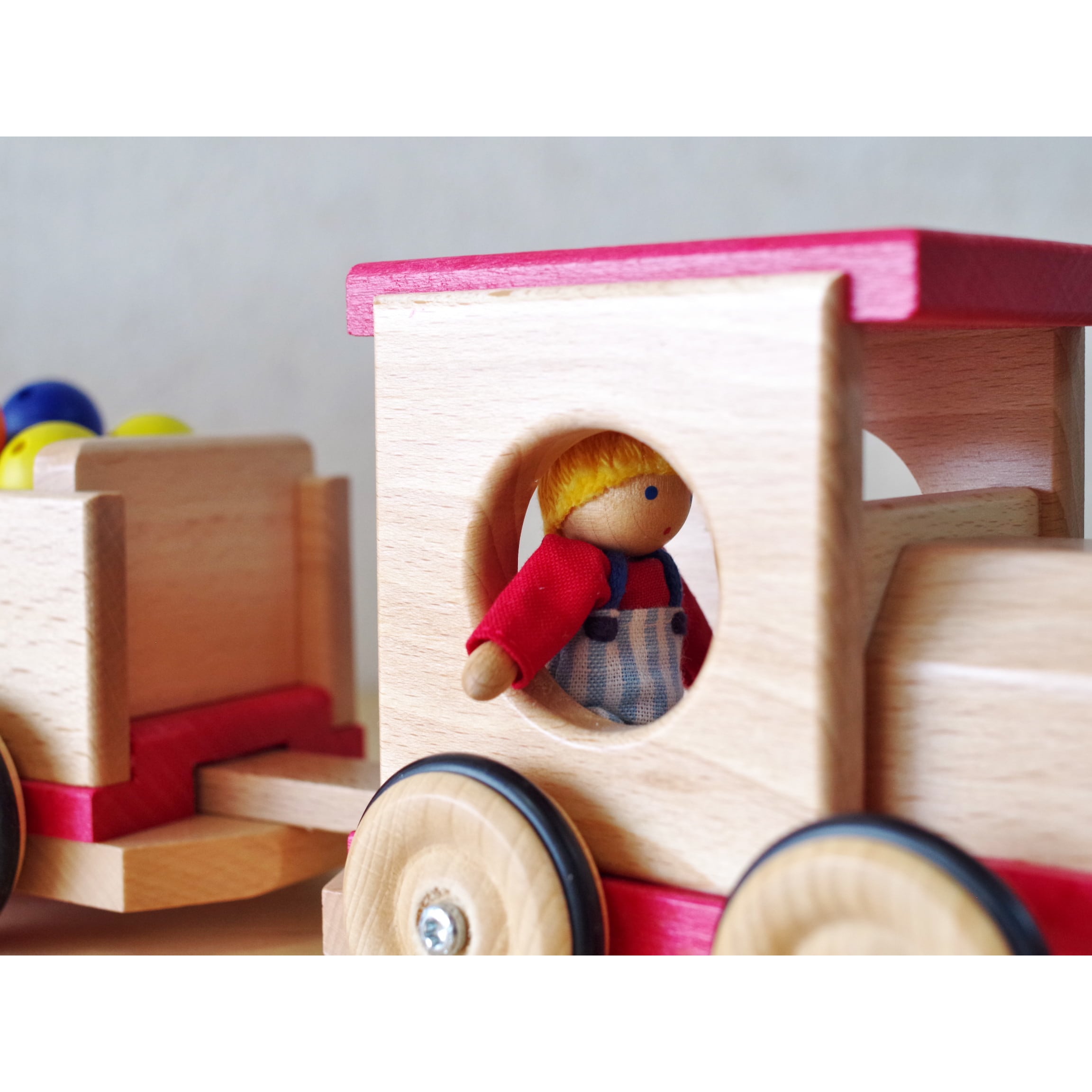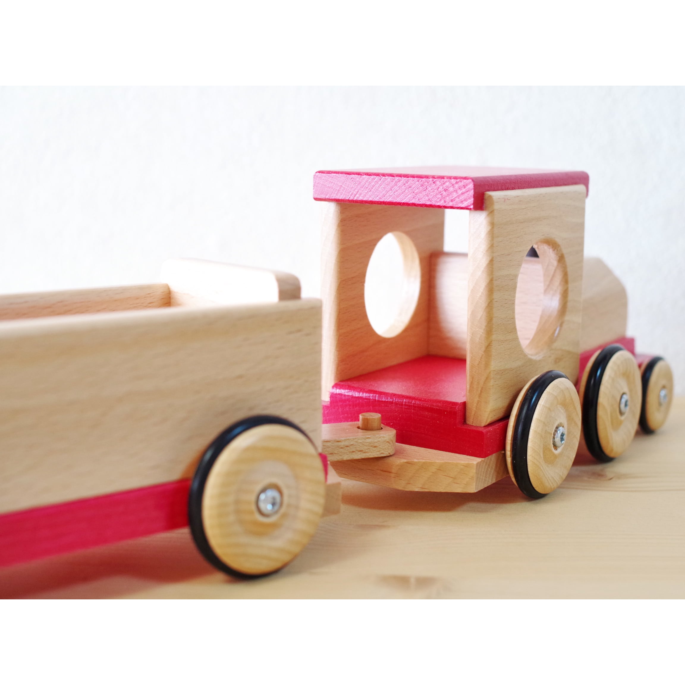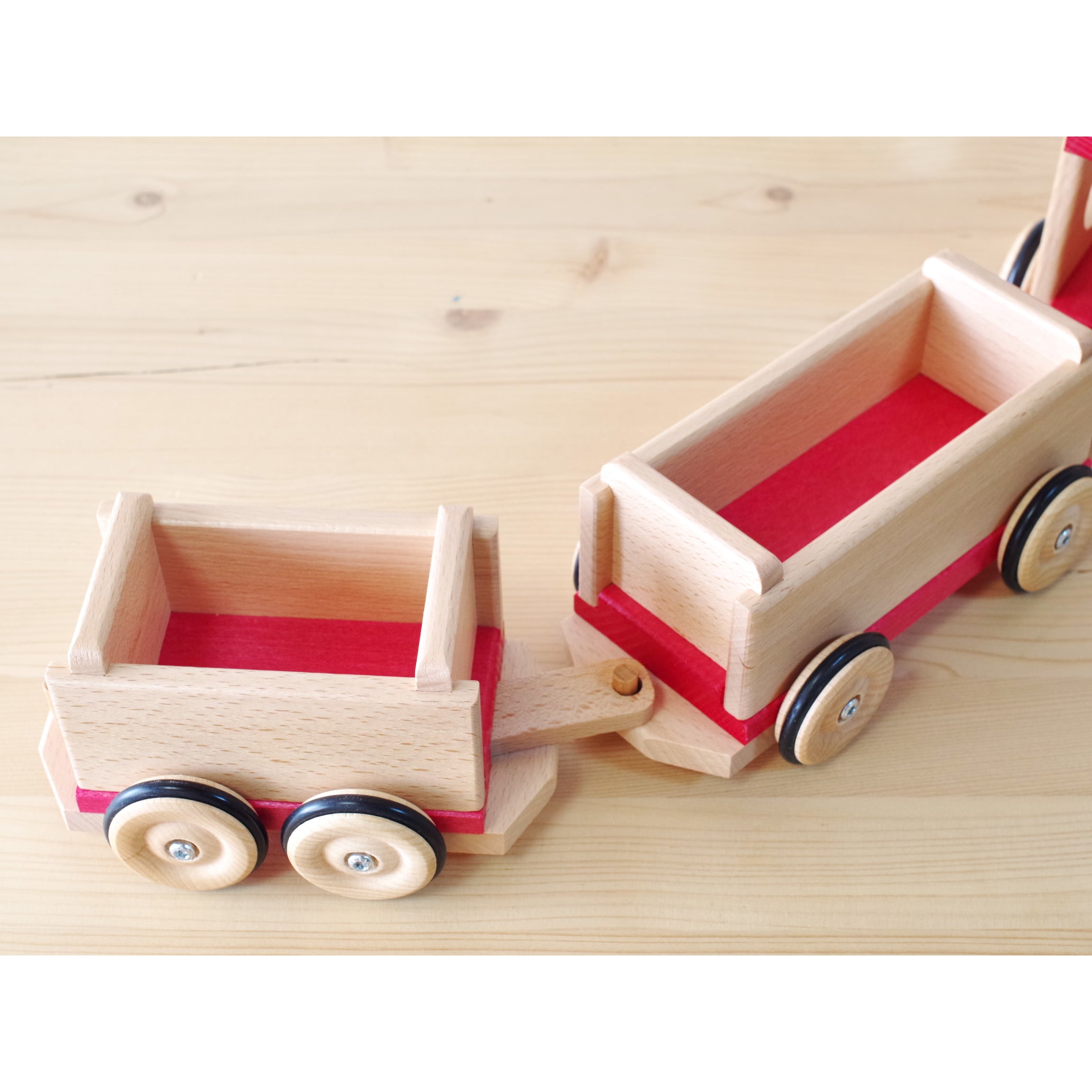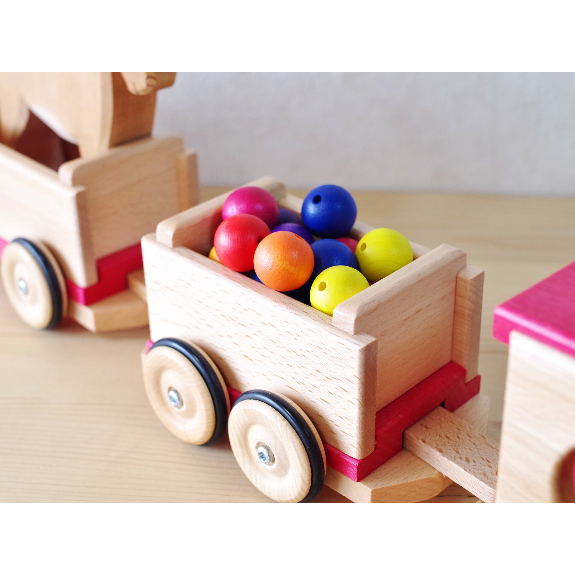 3両つなげると全長56cmと、大ぶりで丈夫な機関車です。荷台や先頭車両の乗り口も大きく、たくさんの荷物や人を乗せることができます。前の車両の突起に穴を引っ掛けることで簡単に連結ができます。