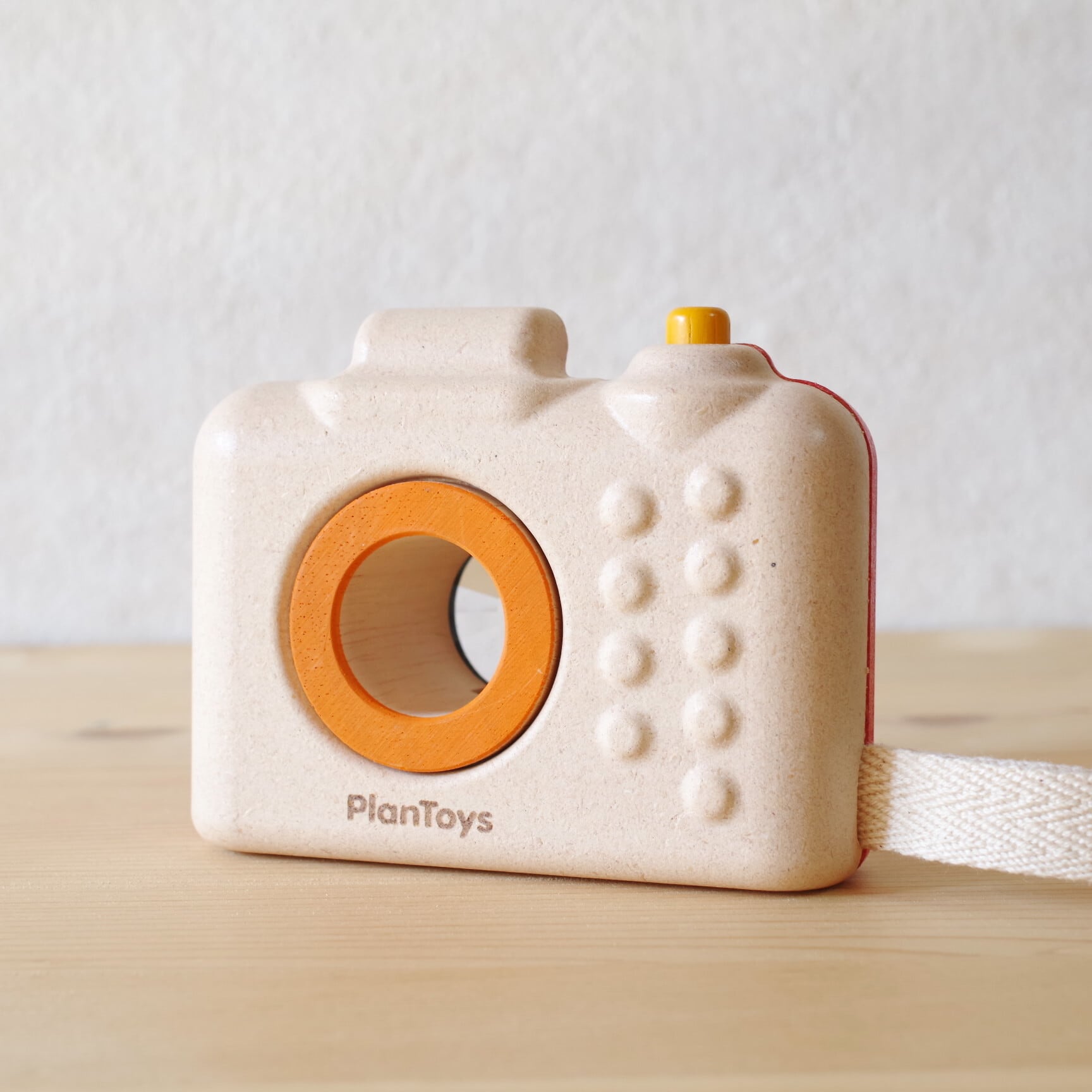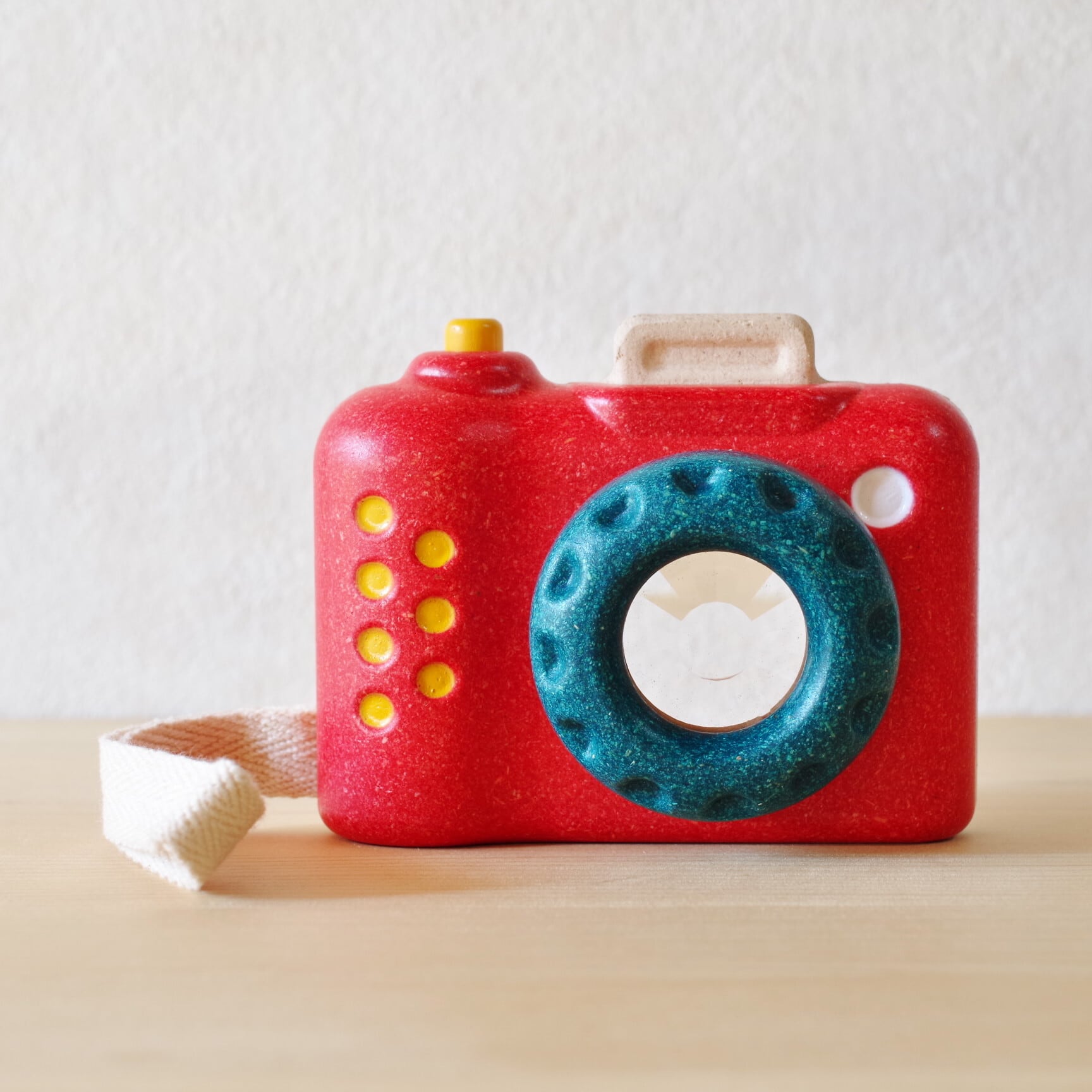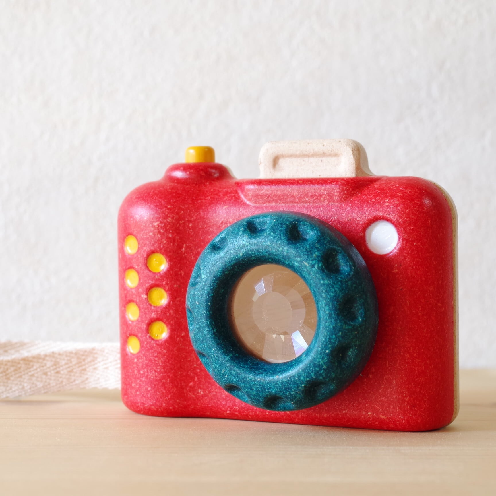 レンズ部分はくるくると回転し、シャッターボタンも押せるつくりで、まるで本物のカメラを扱っているような感覚を味わえます。手にすっぽり収まる丸みのあるフォルムは、小さな子どもでも握りやすく、安全に遊べるデザインです。