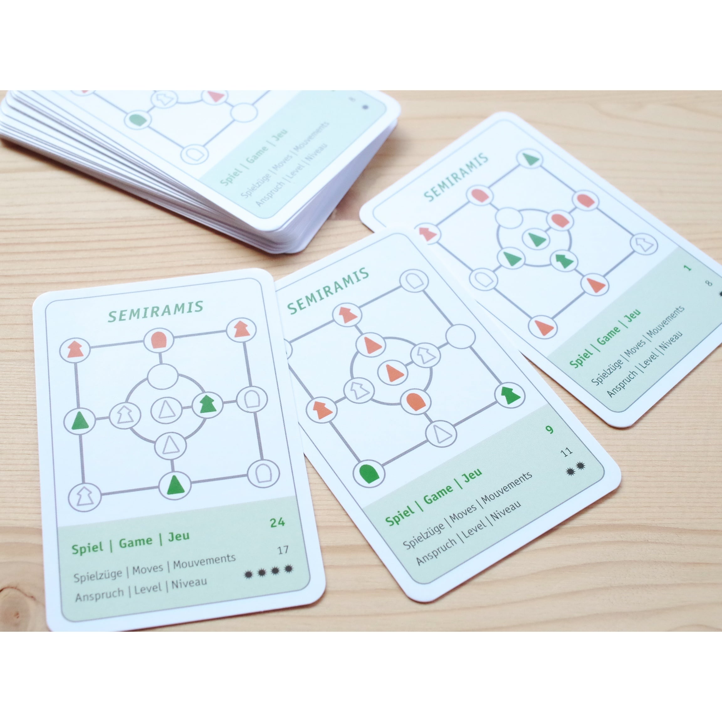 問題は4段階の難易度で24問含まれています(画像4枚目)。問題カードを選び、絵の通りにコマをボードに配置してスタート。木は線に沿ってのみ動かすことができ、ジャンプはできません。