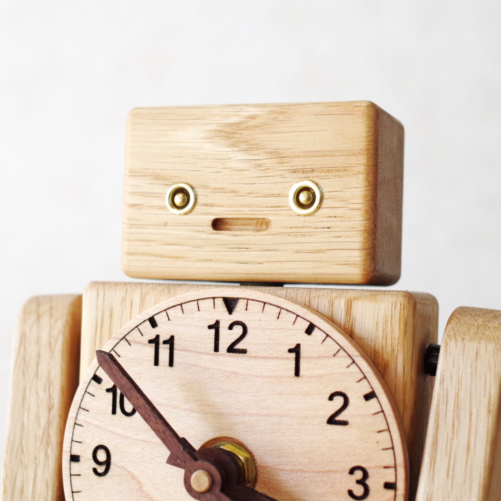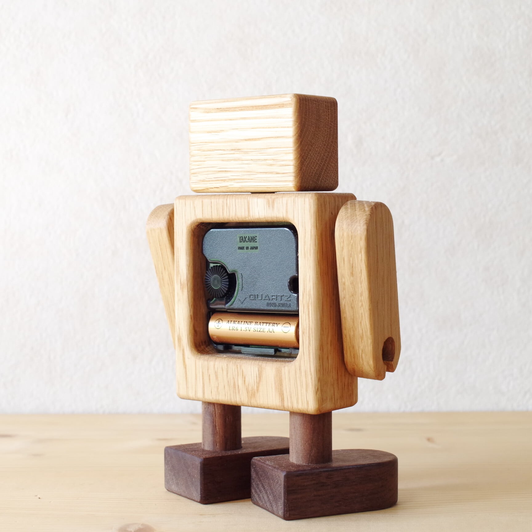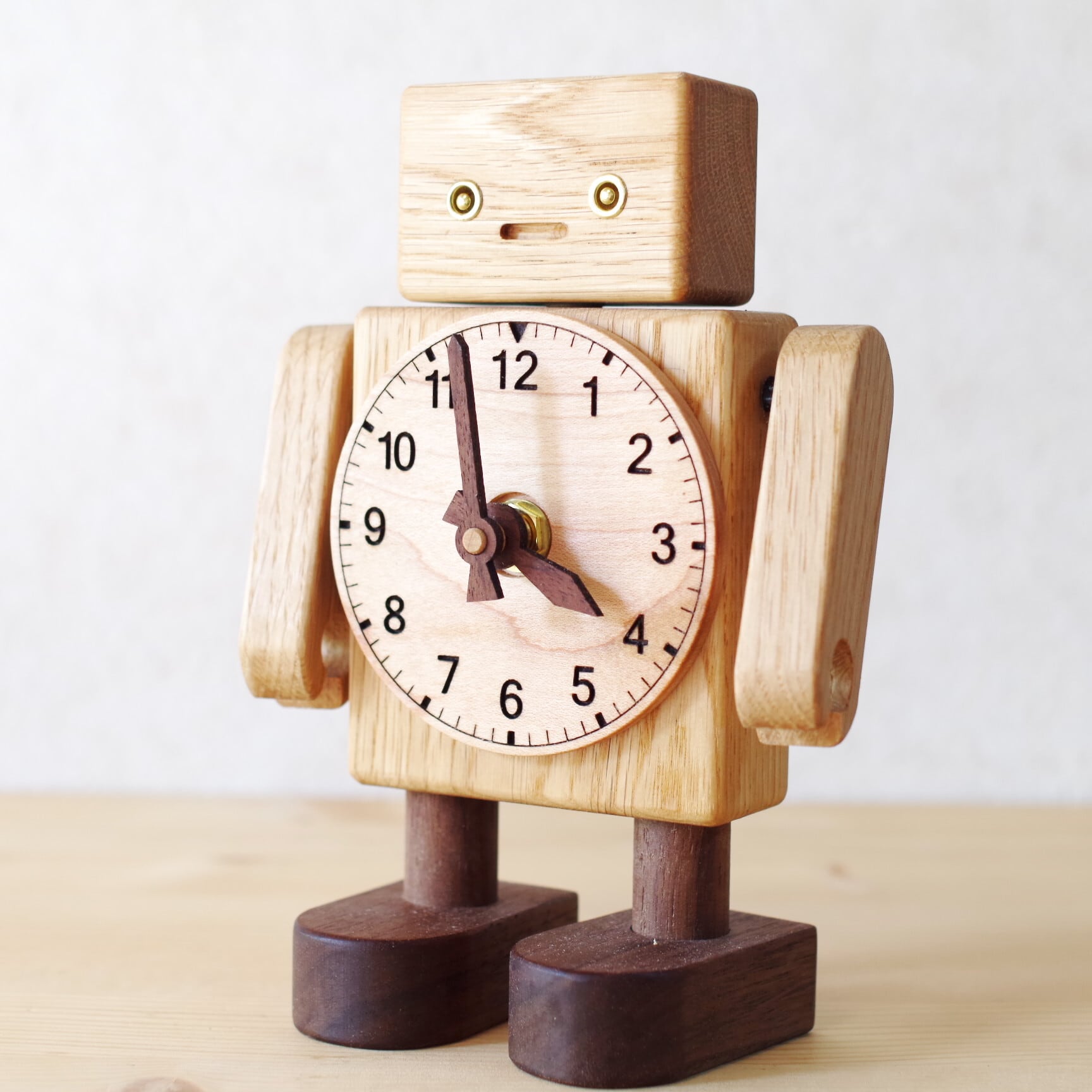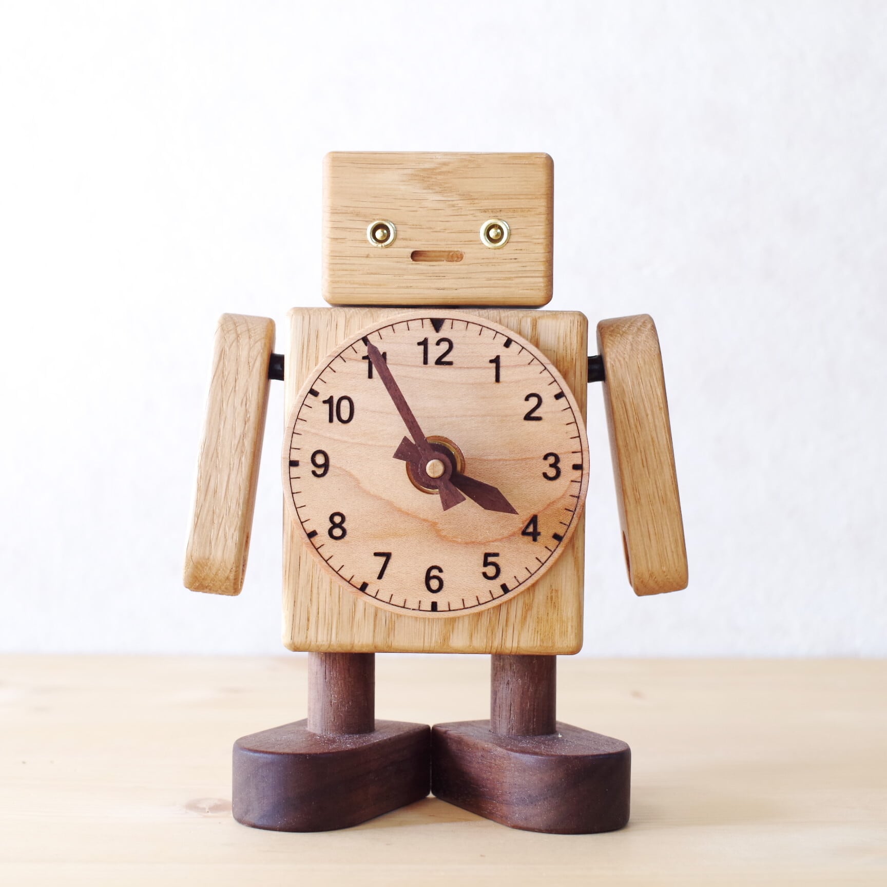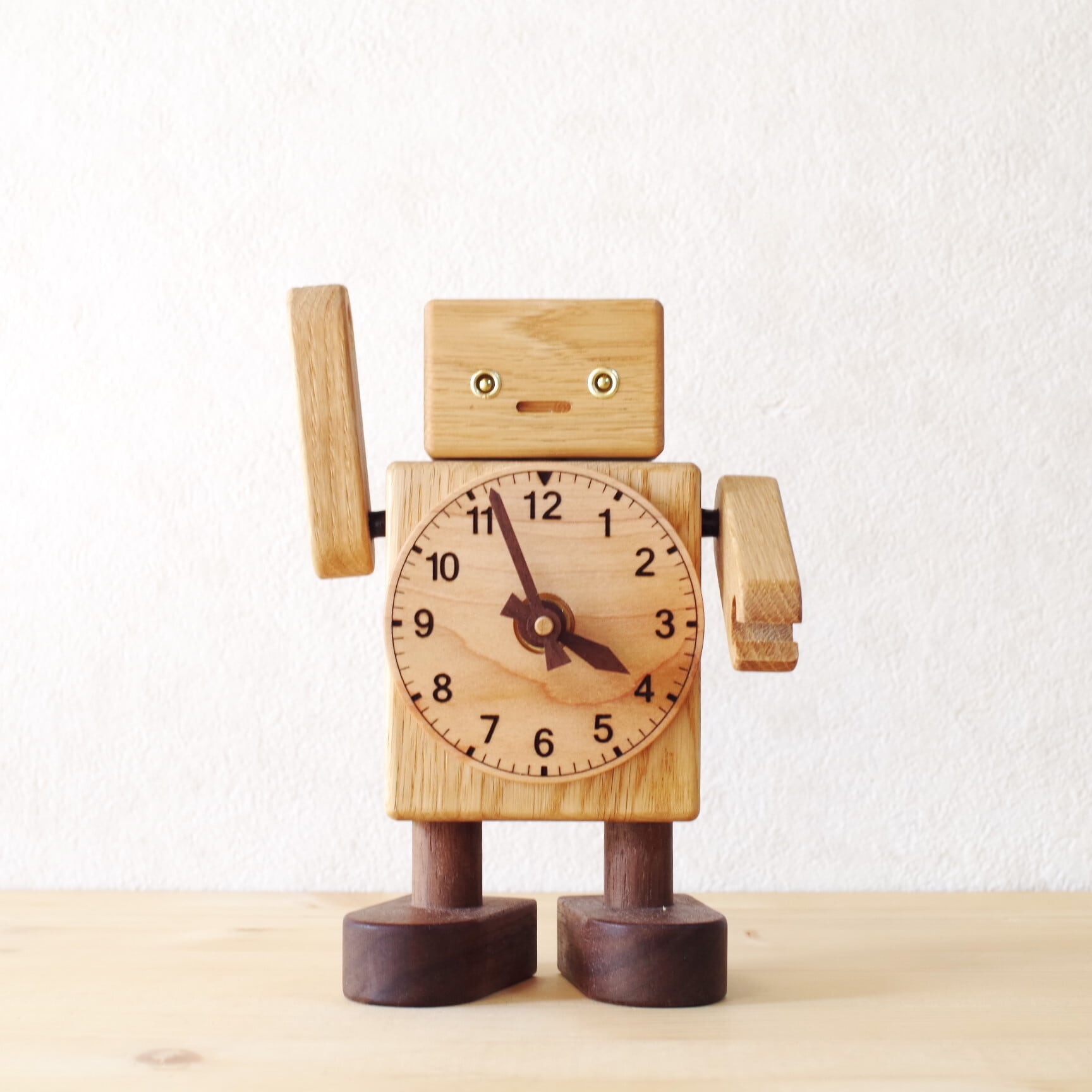 様々なポージングが楽しめる、岡山県在住の玩具作家・若林孝典さんの置時計。ウォルナットとブナを組み合わせた落ち着いたシックな色合いです。
