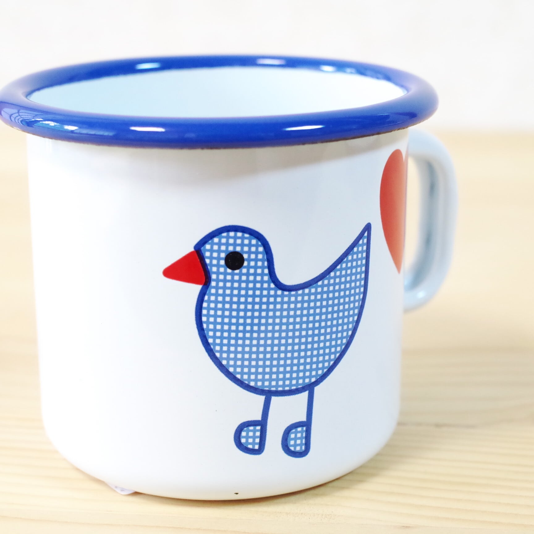 青い鳥とハートが描かれた、シンプルでどこか懐かしさを感じるデザインは、子どもたちの遊び心をくすぐります。カップやお皿は実際の食事にも使える、本物志向のアイテムです。