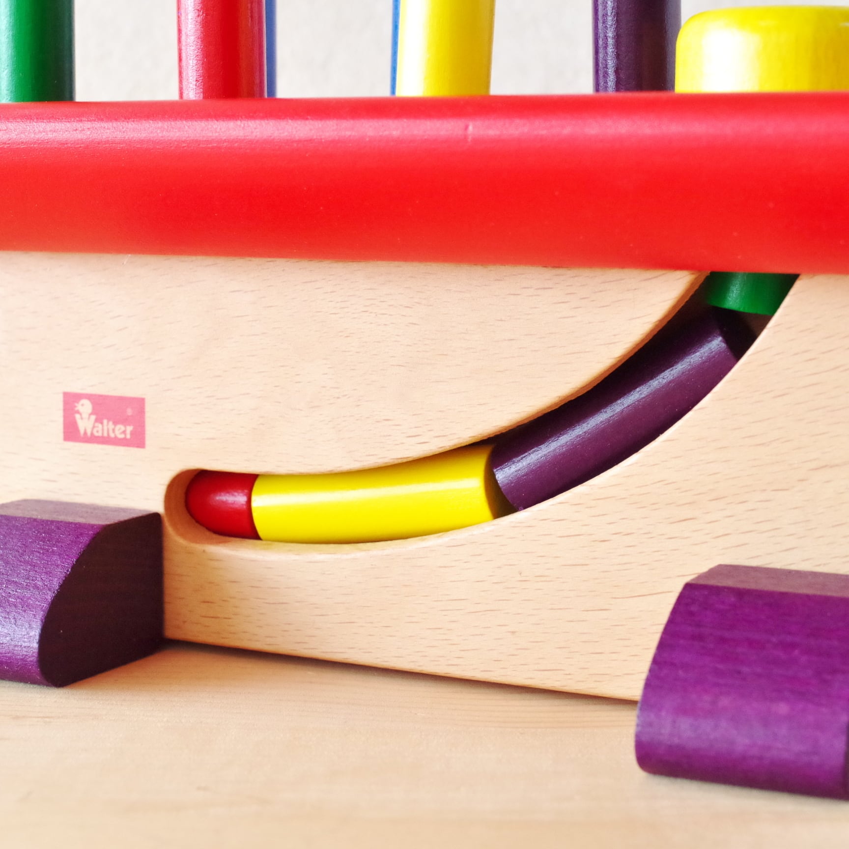 横から見ると、ペグが押し出されていく様子が見えます。強くたたけば、びゅんとペグが飛び出します。ハンマーが上手に使えないうちは、手で押し込んで遊ぶこともできます。