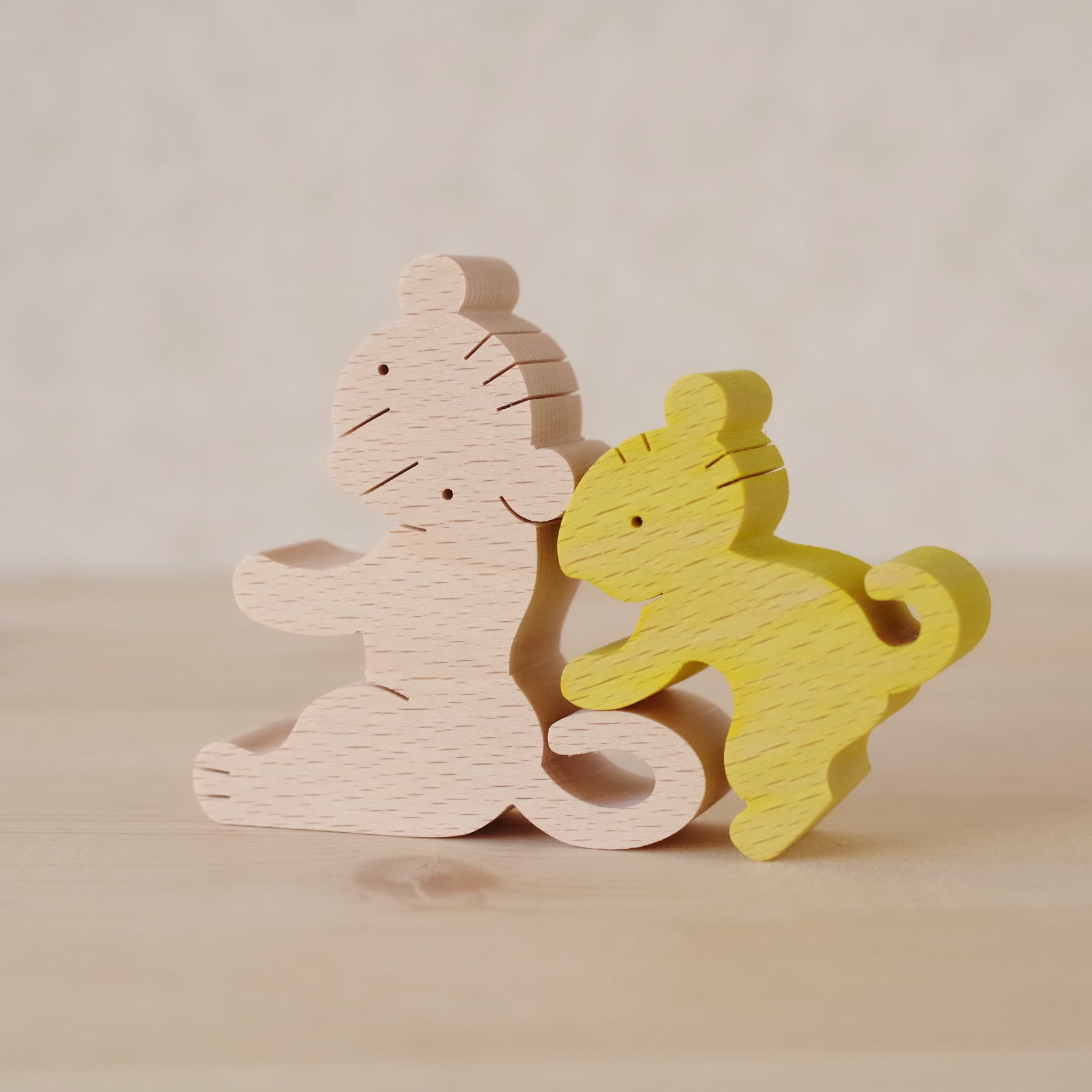 親トラにぴったりくっついて、子トラが抱っこしてもらっています。頭の上に乗せたり、いろんなレイアウトにして遊びましょう。