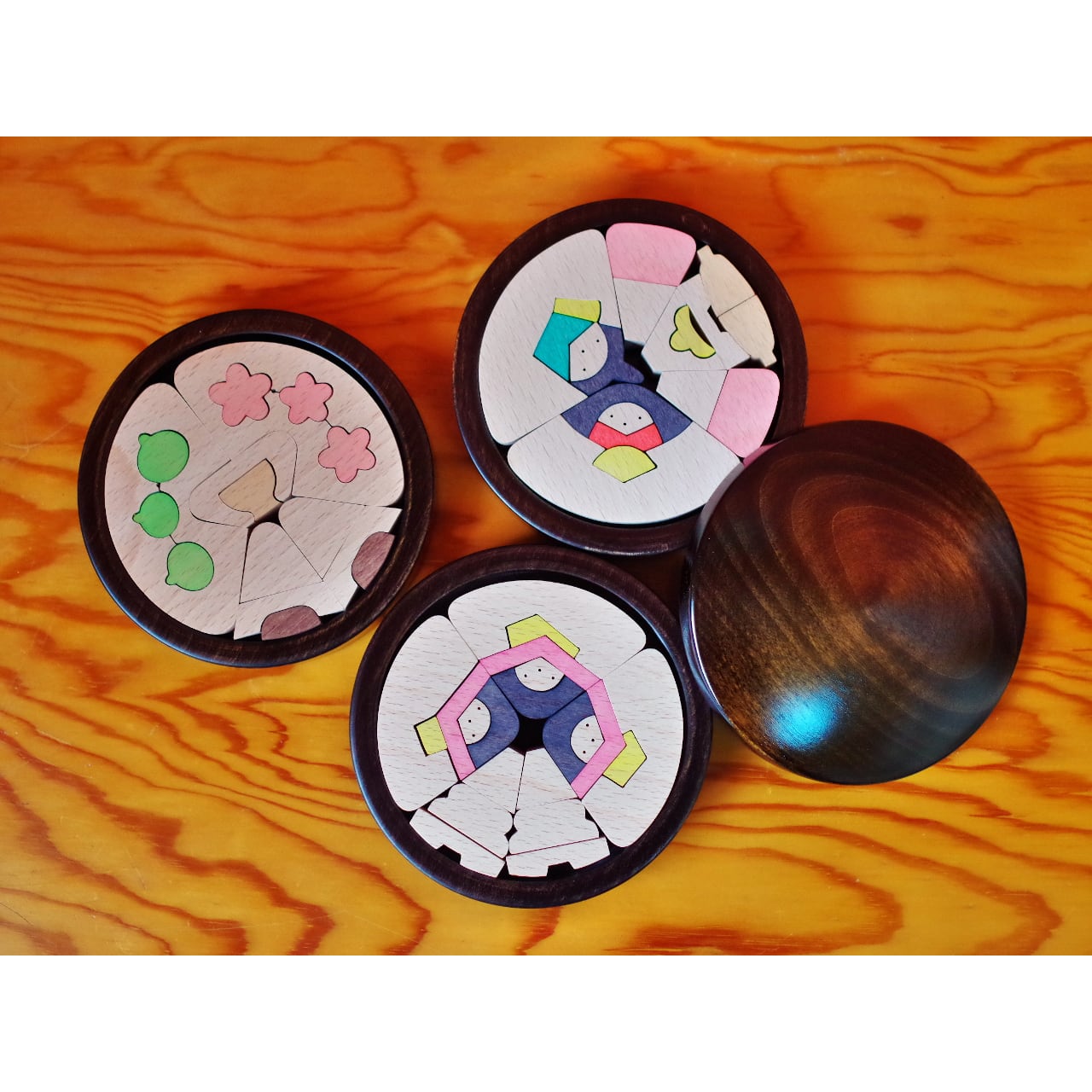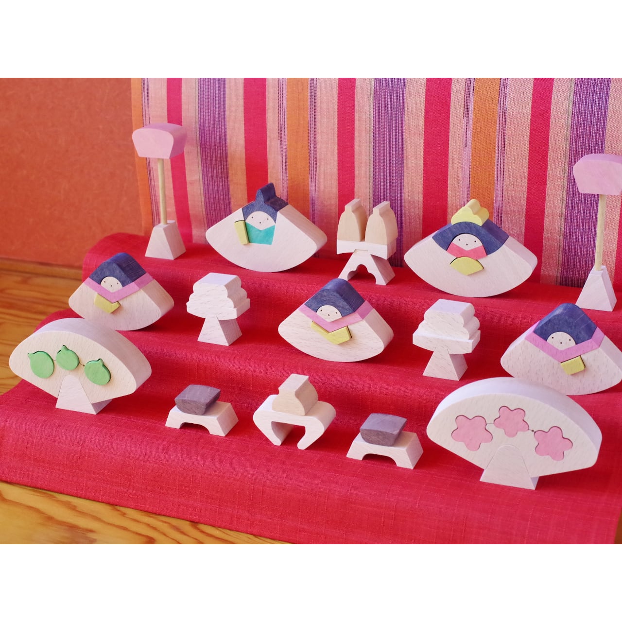 円を中心から放射状に分割してできる扇形が、人形や調度の基本形になっています、一段目は親王、姫、ぼんぼりに三方徳利、二段目は三人官女、高杯、三段目には桜、橘、膳を配しました。本体は20ミリ厚のブナ材を使用しました。全部で56個の木片を、各段ごとに3つの円形容器に収めることができます。