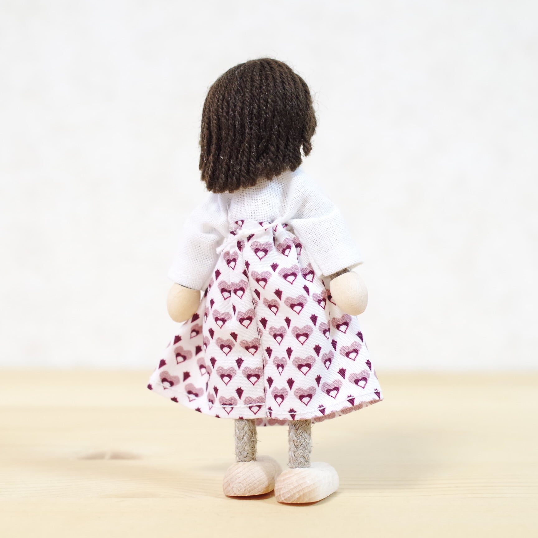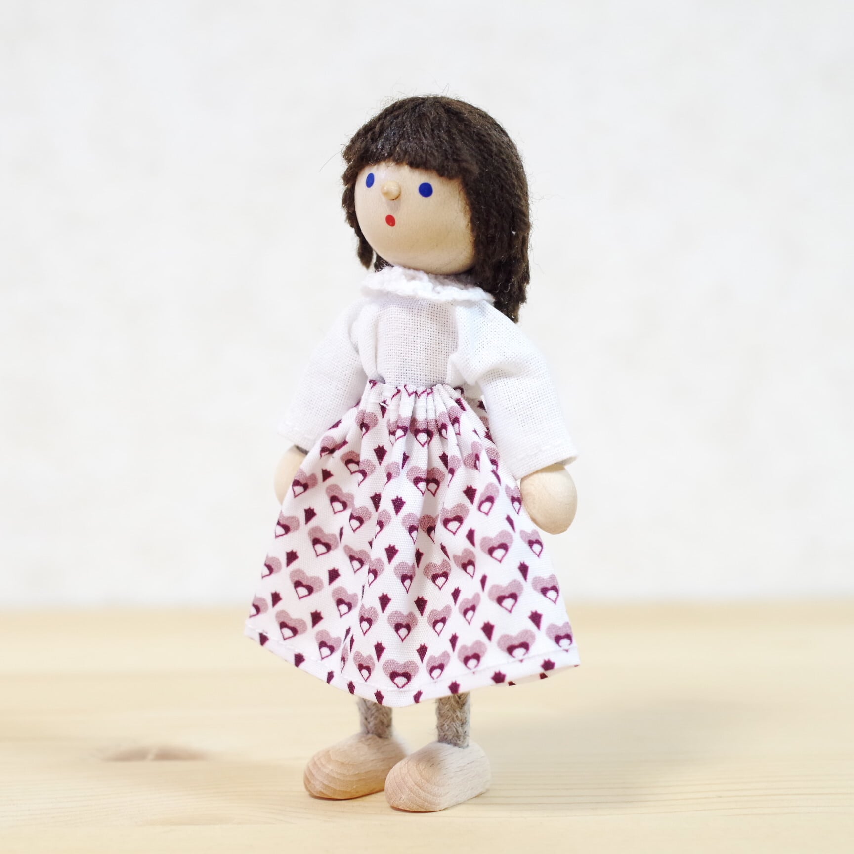 ドイツ・ヘアビック社のドールハウス遊びやごっこ遊びにピッタリな人形。その作りの丁寧さから作り手の愛情が伝わってきますね。手足に針金が入っているので、自由にポーズをとることができます。