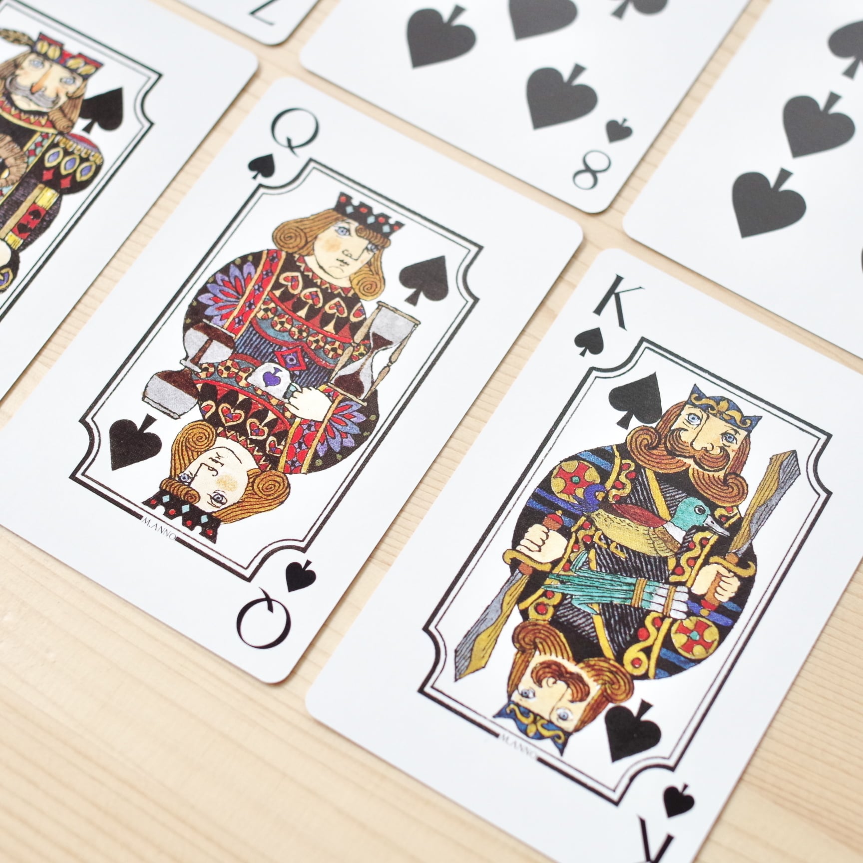 ジャック・クイーン・キング・ジョーカーは細部まで書き込まれた安野らしいイラスト。スートのデザインもオシャレです。大切に手元に取っておきたくなるトランプです。