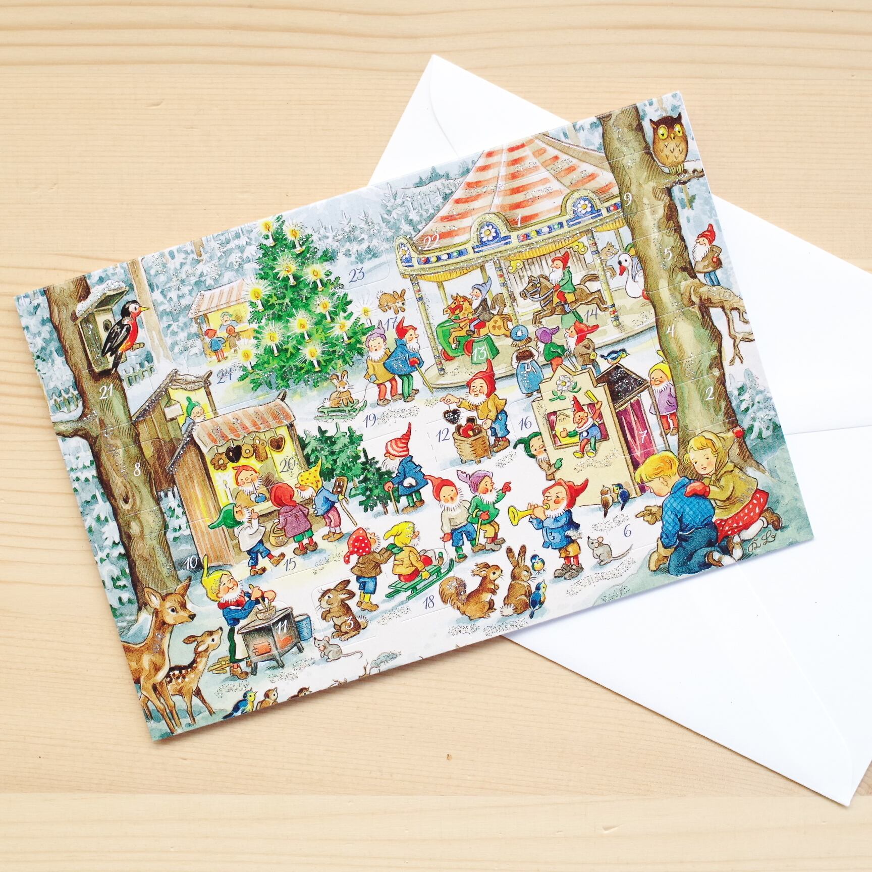 カードタイプのアドベントカレンダー。A6サイズの封筒付きです。カレンダーのように立てることもできます。