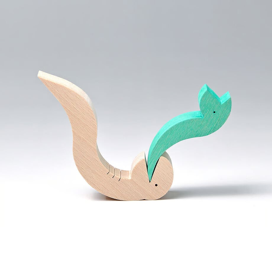 動物親子の組み木の中で、最もシンプルな組み合わせの組み木。親は口で子を捕まえることができます。